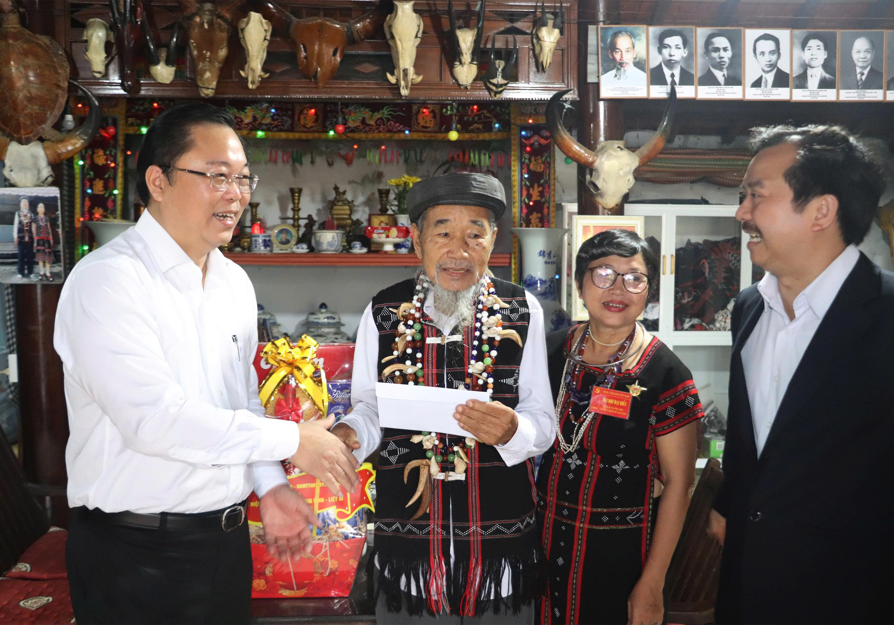 Chủ tịch Ủy ban MTTQ Việt Nam thành phố Lê Trí Thanh (biên trái) tặng quà già Y Kông (97 tuổi, thôn Tống Coói, xã Sông Vàng). Ảnh: ĐẮC MẠNH