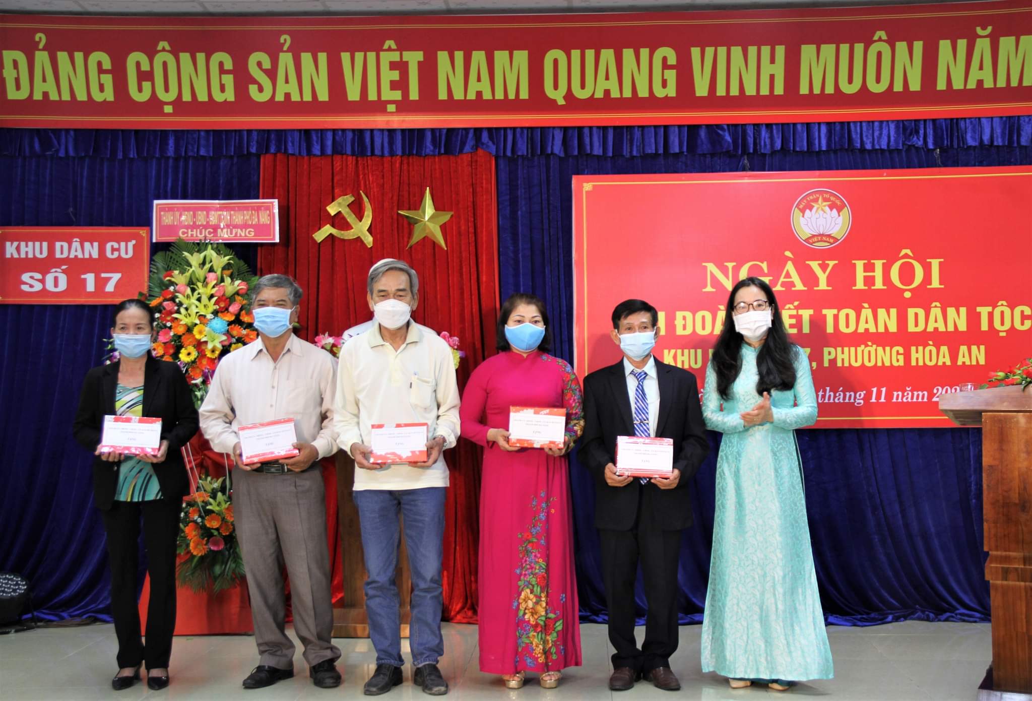 Dịp này, Ủy ban MTTQ Việt Nam thành phố đã trao tặng 05 suất quà động viên cán bộ Mặt trận đã có nhiều nổ lực trong phòng, chống dịch Covid-19 tại khu dân cư; Mặt trận quận tặng 06 suất quà, cùng nhiều giấy khen và phần quà của phường Hòa An và KDC 17.