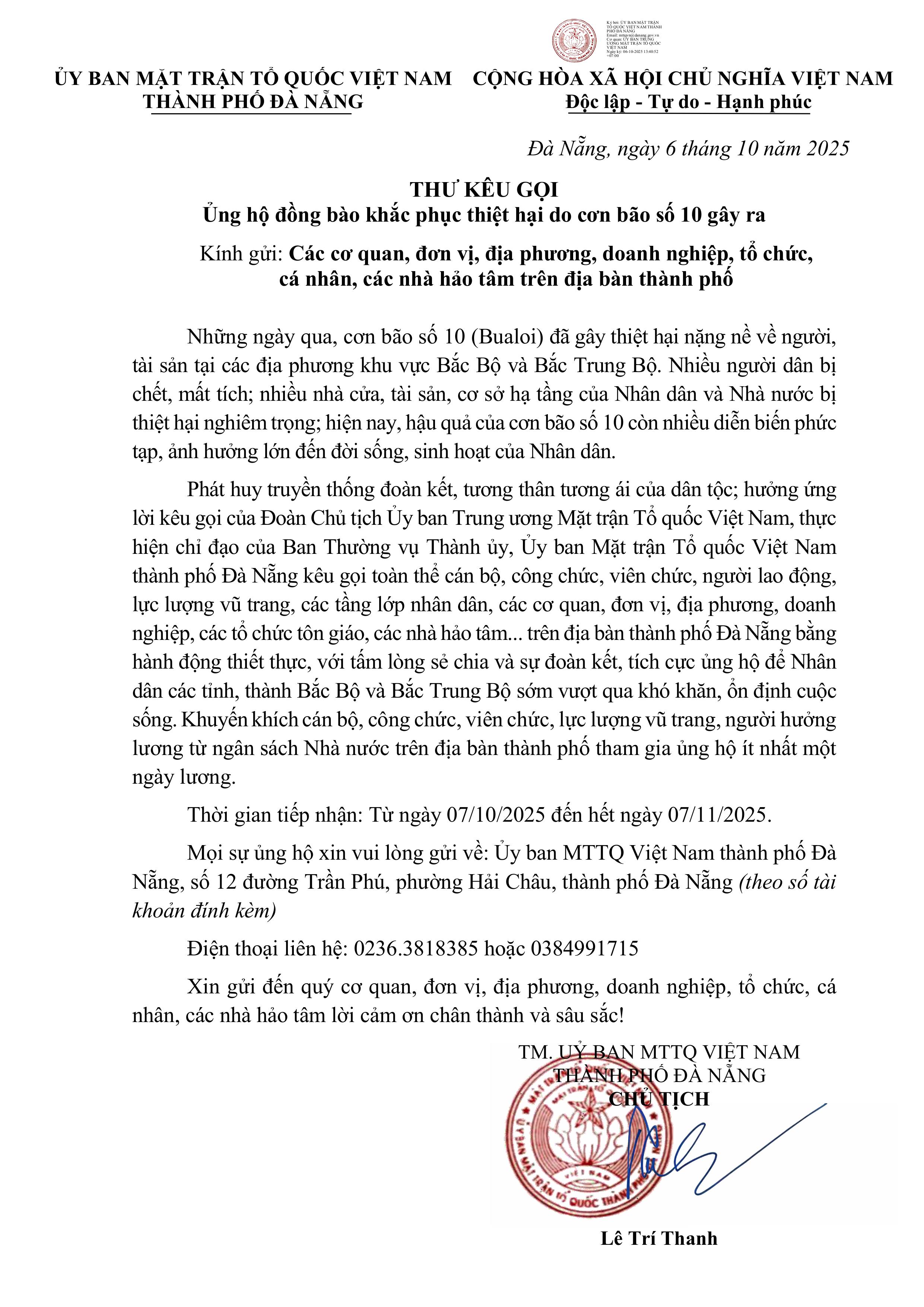 Trong thư, Chủ tịch Ủy ban Mặt trận Tổ quốc Việt Nam thành phố Đà Nẵng Lê Trí Thanh nêu rõ: những ngày qua, cơn bão số 10 (Bualoi) đã gây thiệt hại nặng nề về người và tài sản tại các tỉnh, thành phố khu vực Bắc Bộ và Bắc Trung Bộ. Nhiều người dân bị chết, mất tích; nhiều nhà cửa, tài sản, cơ sở hạ tầng của Nhân dân và Nhà nước bị thiệt hại nghiêm trọng. Hậu quả của cơn bão vẫn còn diễn biến phức tạp, ảnh hưởng lớn đến đời sống, sinh hoạt của Nhân dân.