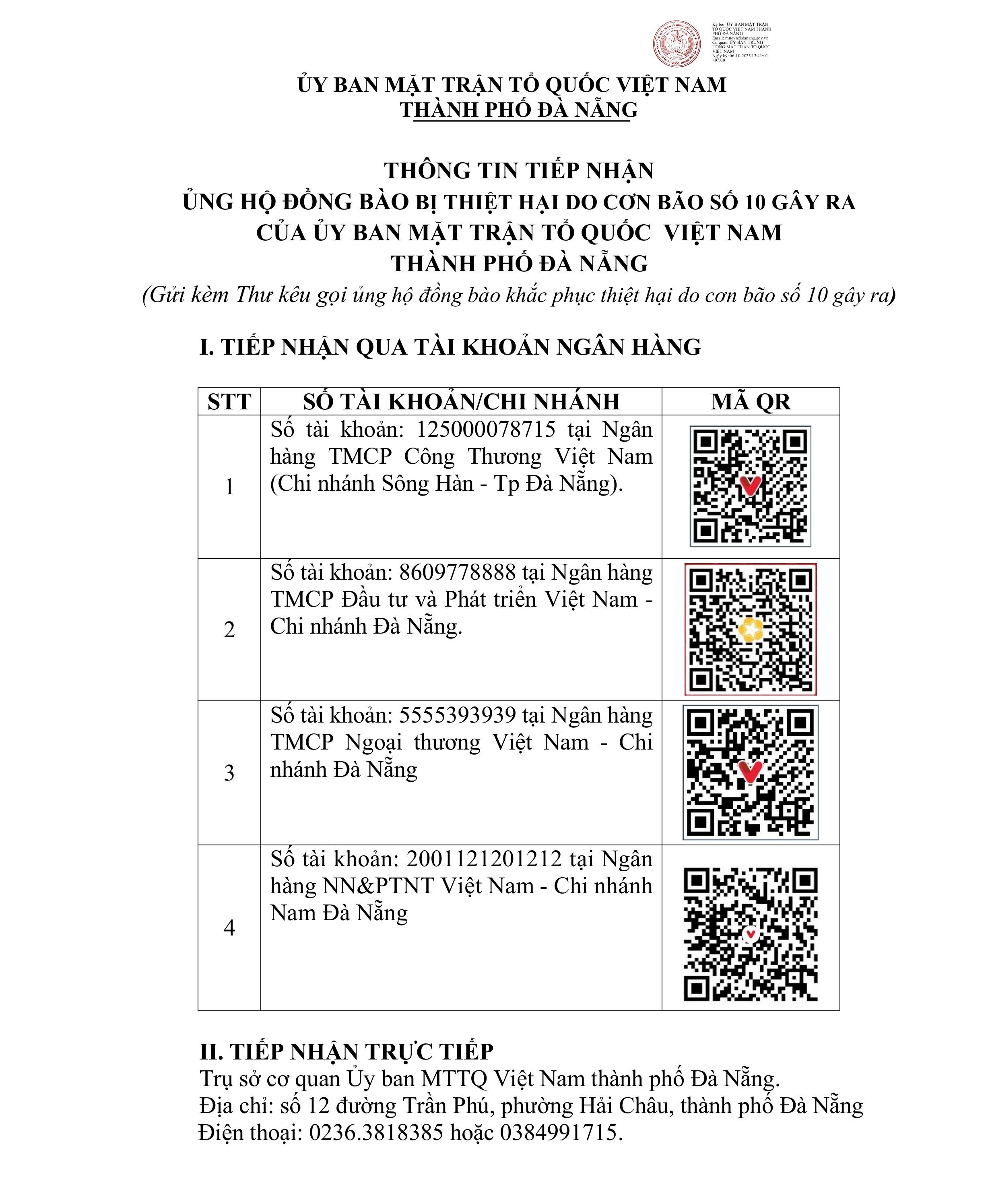 Trước tình hình cấp bách đó, phát huy truyền thống đoàn kết, tương thân tương ái của dân tộc; hưởng ứng lời kêu gọi của Đoàn Chủ tịch Ủy ban Trung ương Mặt trận Tổ quốc Việt Nam, thực hiện chỉ đạo của Ban Thường vụ Thành ủy, Ủy ban Mặt trận Tổ quốc Việt Nam thành phố Đà Nẵng kêu gọi toàn thể cán bộ, công chức, viên chức, người lao động, lực lượng vũ trang, các tầng lớp nhân dân, các cơ quan, đơn vị, địa phương, doanh nghiệp, các tổ chức tôn giáo, các nhà hảo tâm... trên địa bàn thành phố Đà Nẵng bằng hành động thiết thực, với tấm lòng sẻ chia và sự đoàn kết, tích cực ủng hộ để Nhân dân các tỉnh, thành Bắc Bộ và Bắc Trung Bộ sớm vượt qua khó khăn, ổn định cuộc sống.