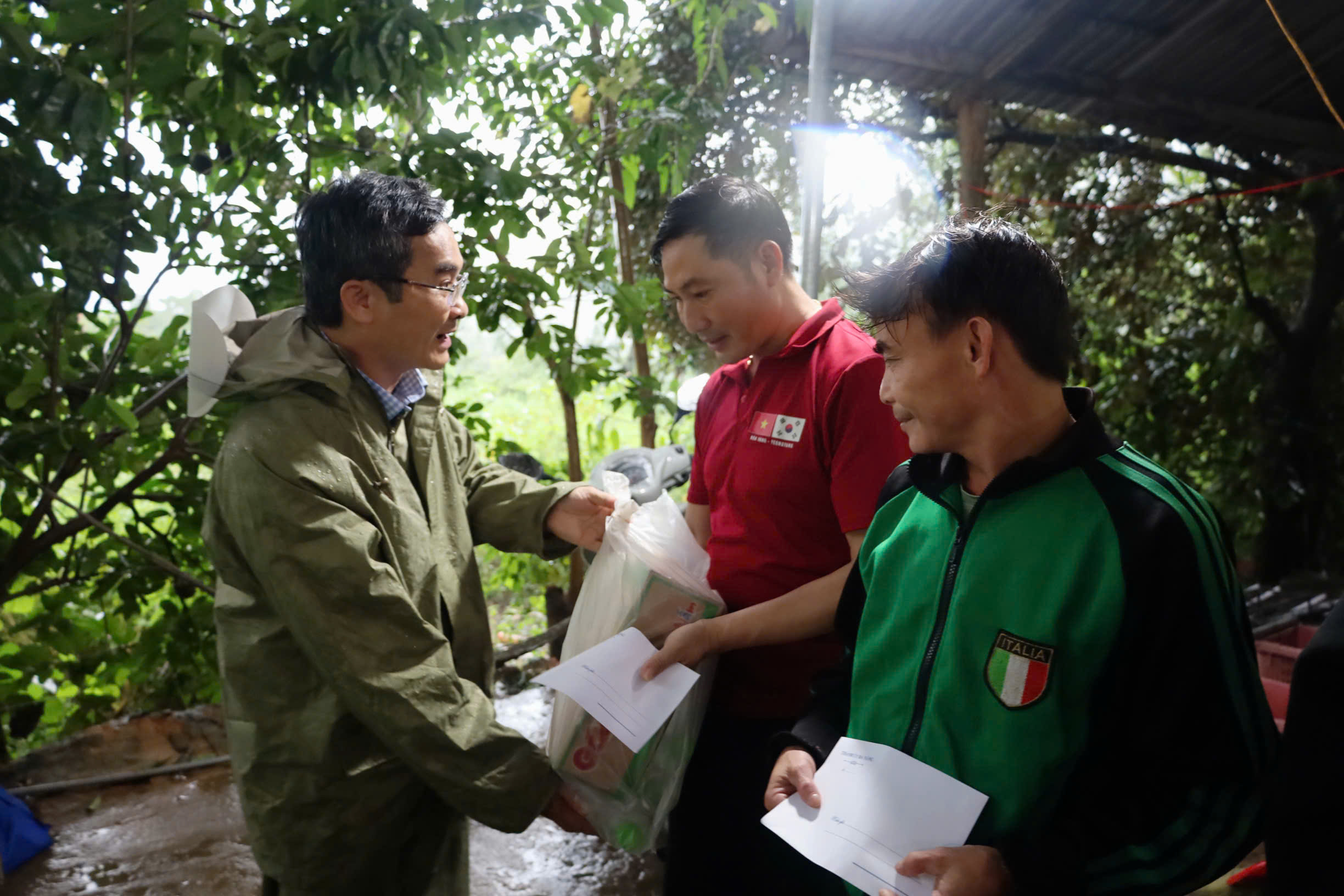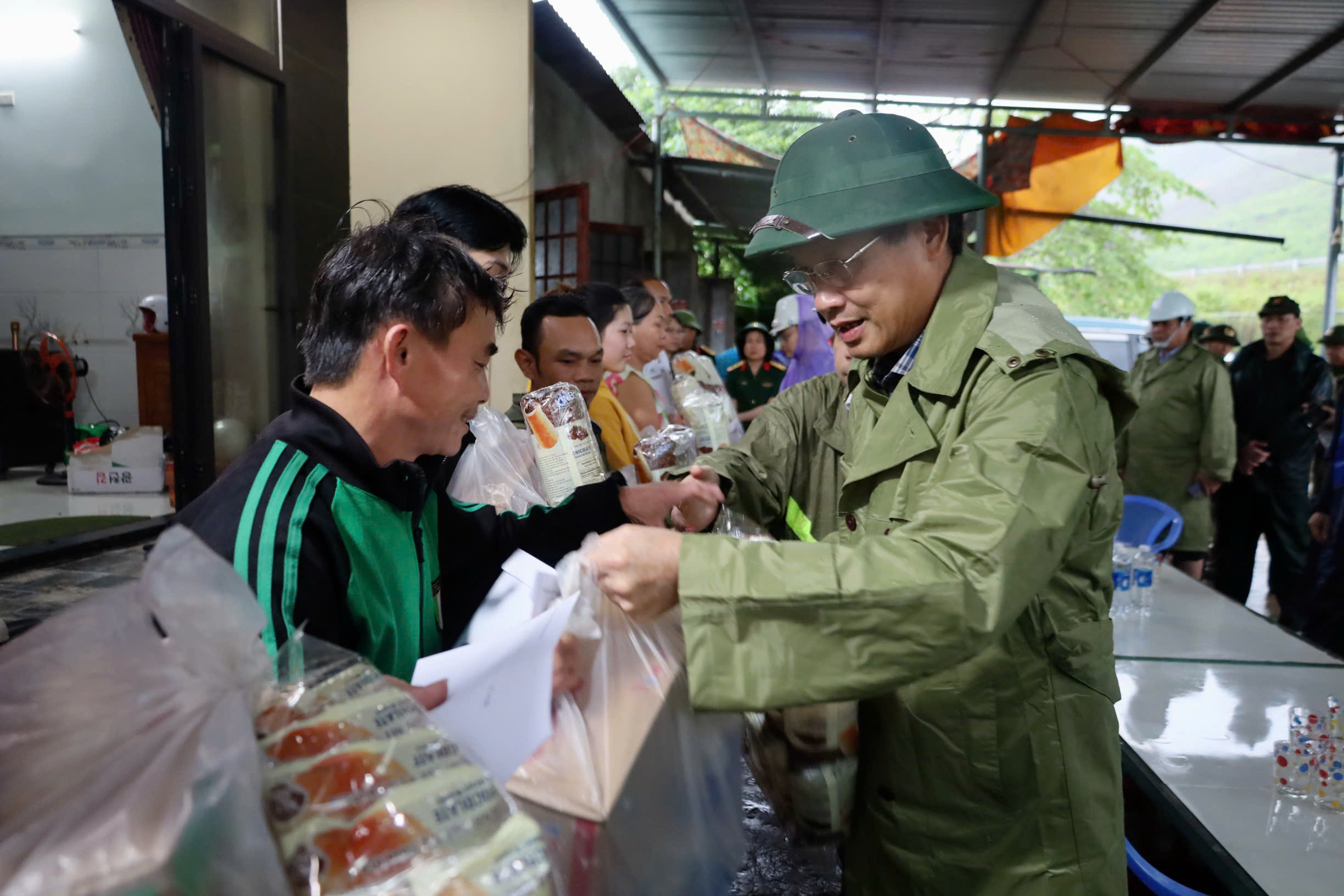 Sau khi kiểm tra các vị trí sạt lở, Phó Bí thư Thành ủy đến nơi ở tạm của 7 hộ dân tổ dân phố Tà Lang để thăm hỏi tình hình sức khỏe, trao quà hỗ trợ và động viên người dân nỗ lực vượt qua khó khăn, bảo đảm an toàn tính mạng và tài sản.