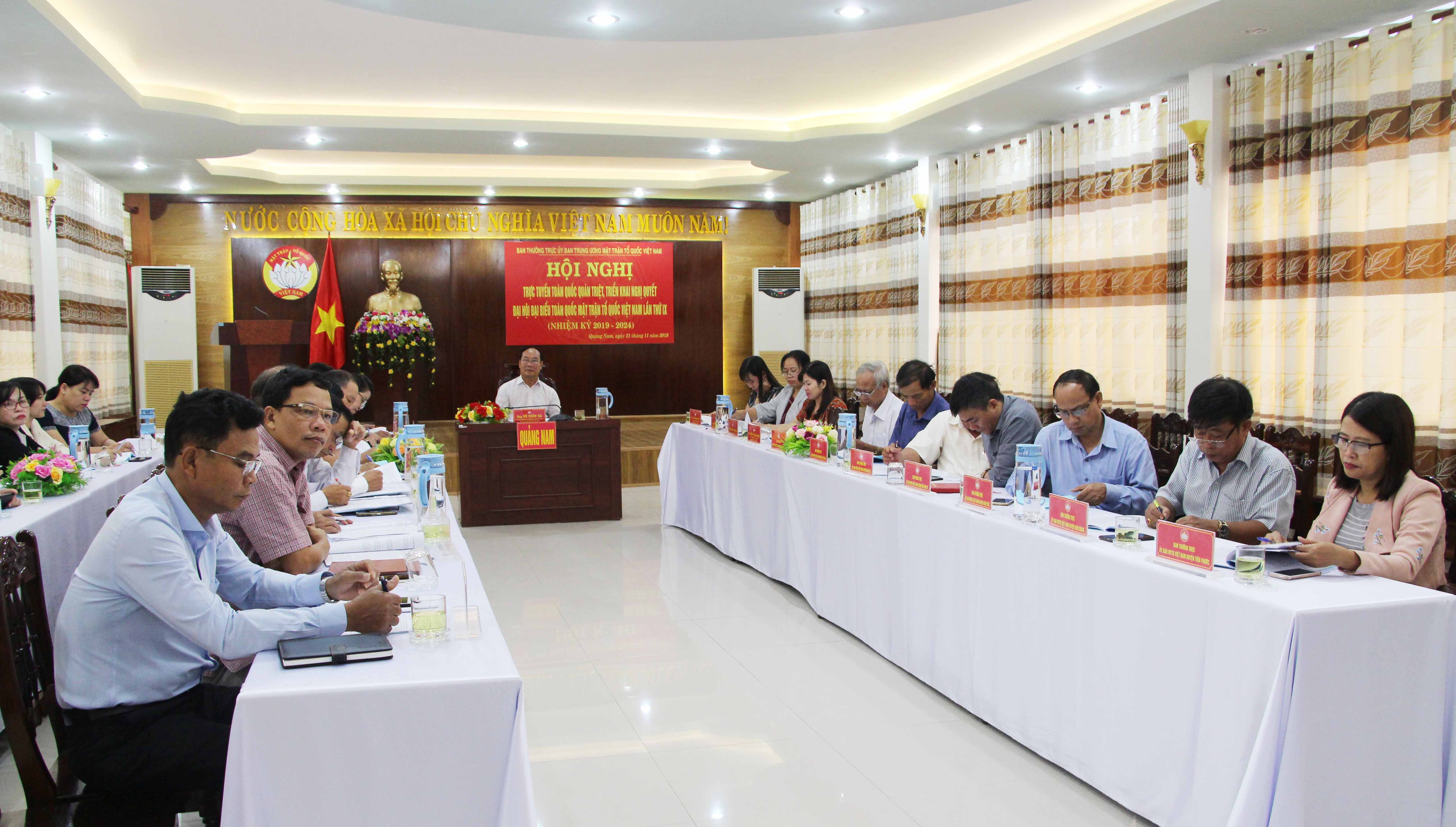 Tại hội nghị, các đại biểu được nghe các đồng chí trong Ban Thường trực Ủy ban Trung ương MTTQ Việt Nam quán triệt những nội dung của 05 chương trình hành động Nghị quyết Đại hội đại biểu toàn quốc MTTQ Việt Nam lần thứ IX, nhiệm kỳ 2019 - 2024: