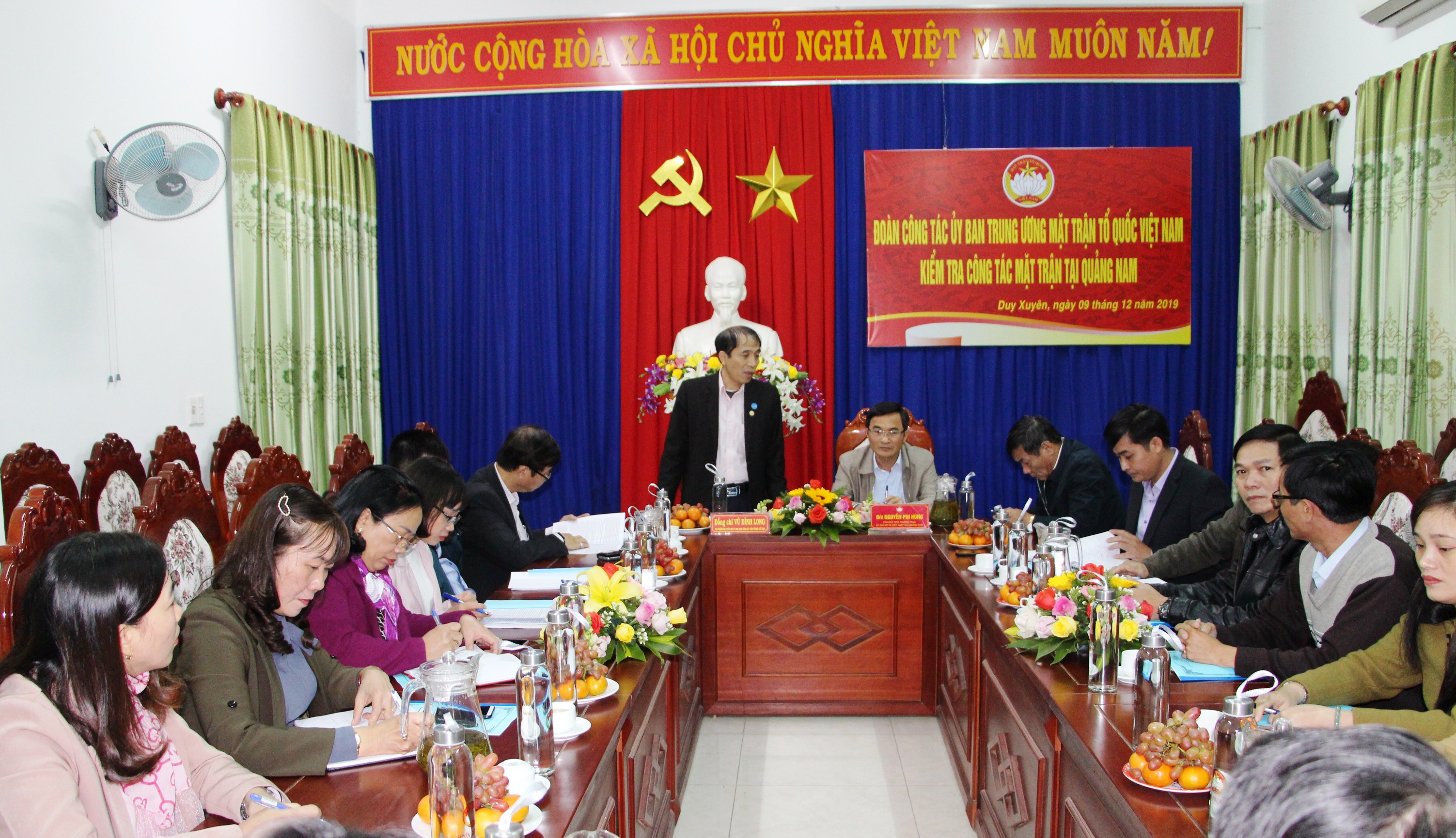 Trước đó, chiều ngày 9/12, đoàn công tác do đồng chí Vũ Đình Long- Phó Ban Tuyên giáo Ủy ban Trung ương MTTQ Việt Nam làm Trưởng đoàn có buổi kiểm tra công tác Mặt trận tại Ủy ban MTTQ Việt Nam huyện Duy Xuyên, tỉnh Quảng Nam.