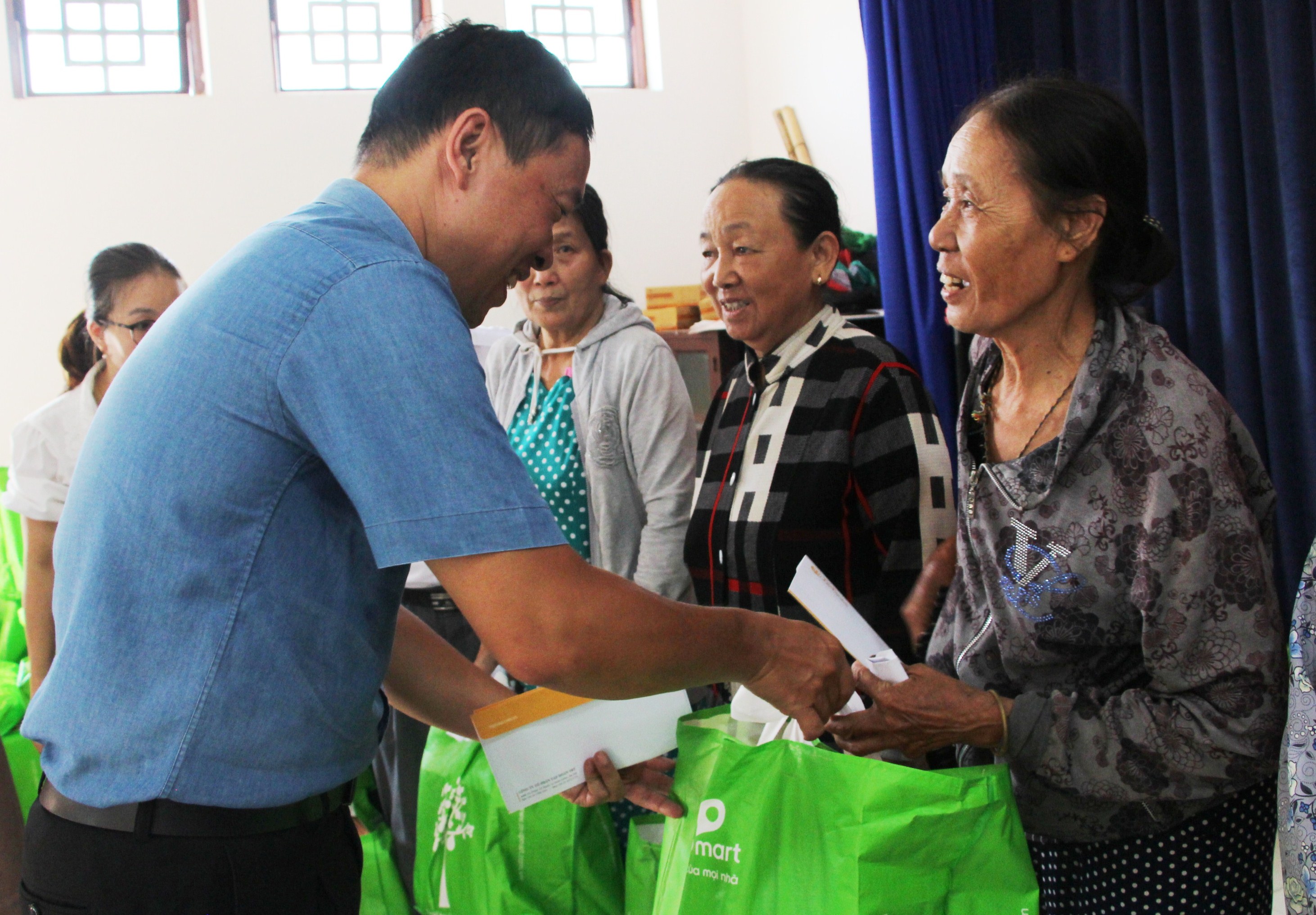 Ông Võ Xuân Ca và ông Lê Định trao quà cho các hộ nghèo, cận nghèo, khó khăn do ảnh hưởng dịch Covid-19