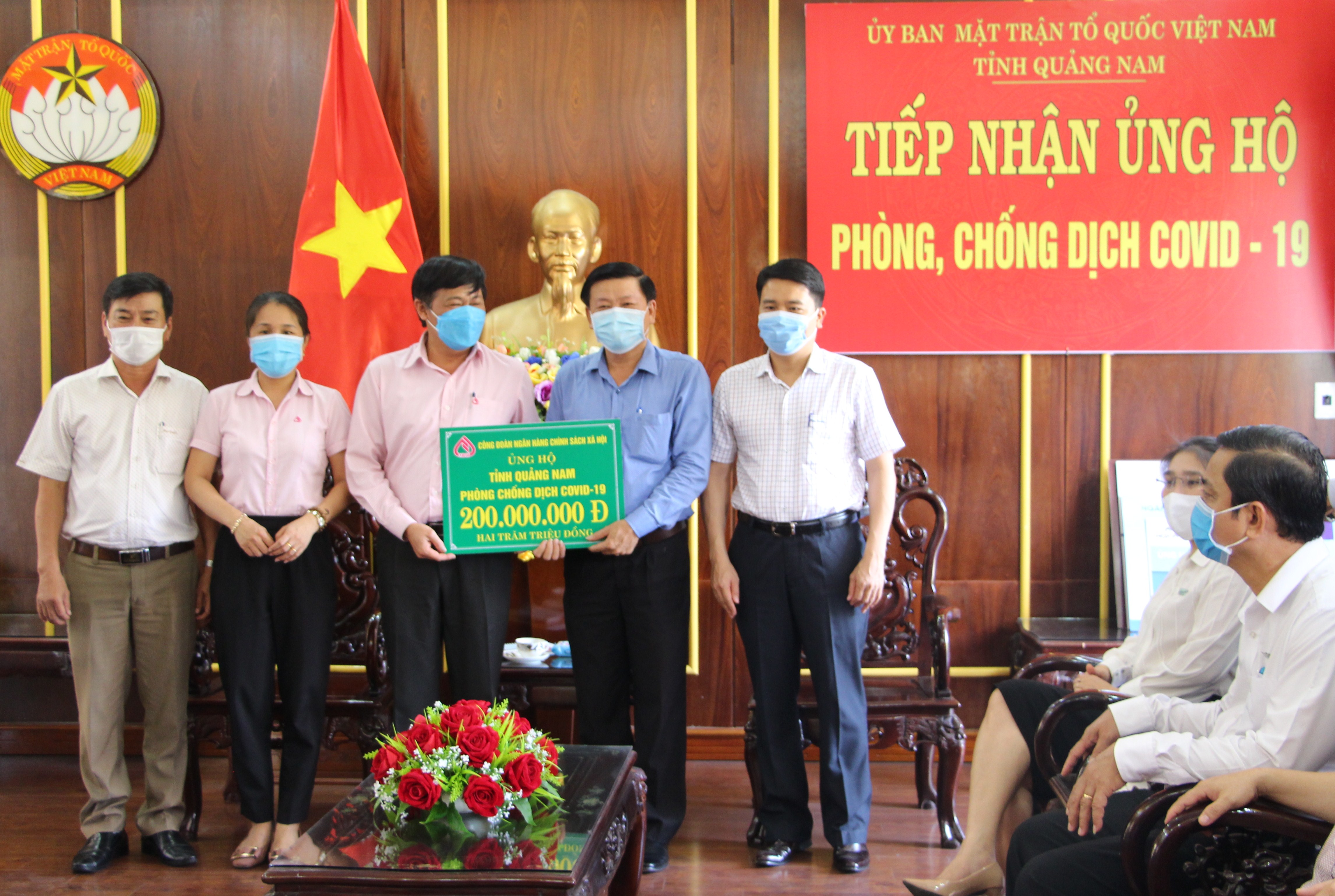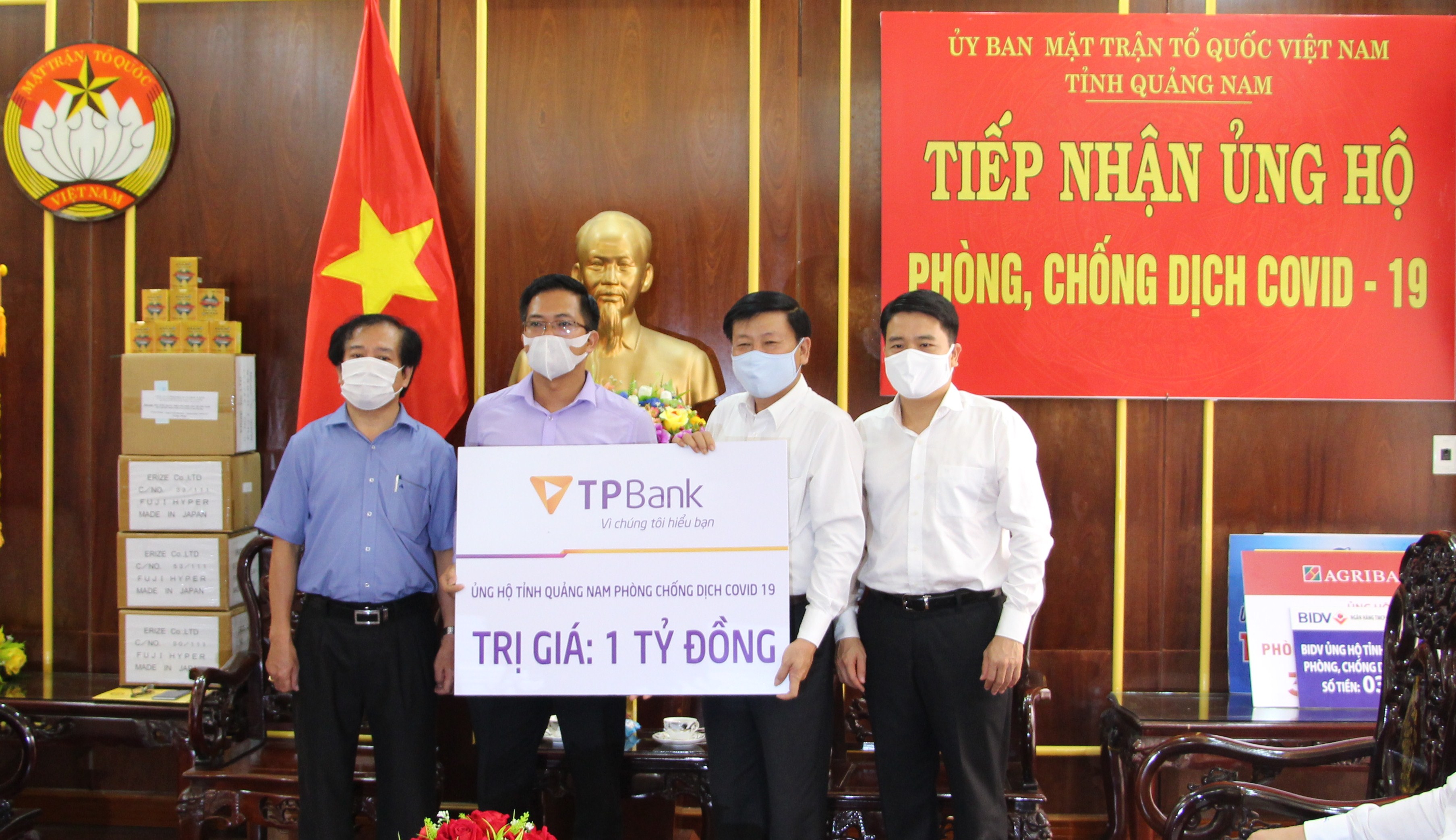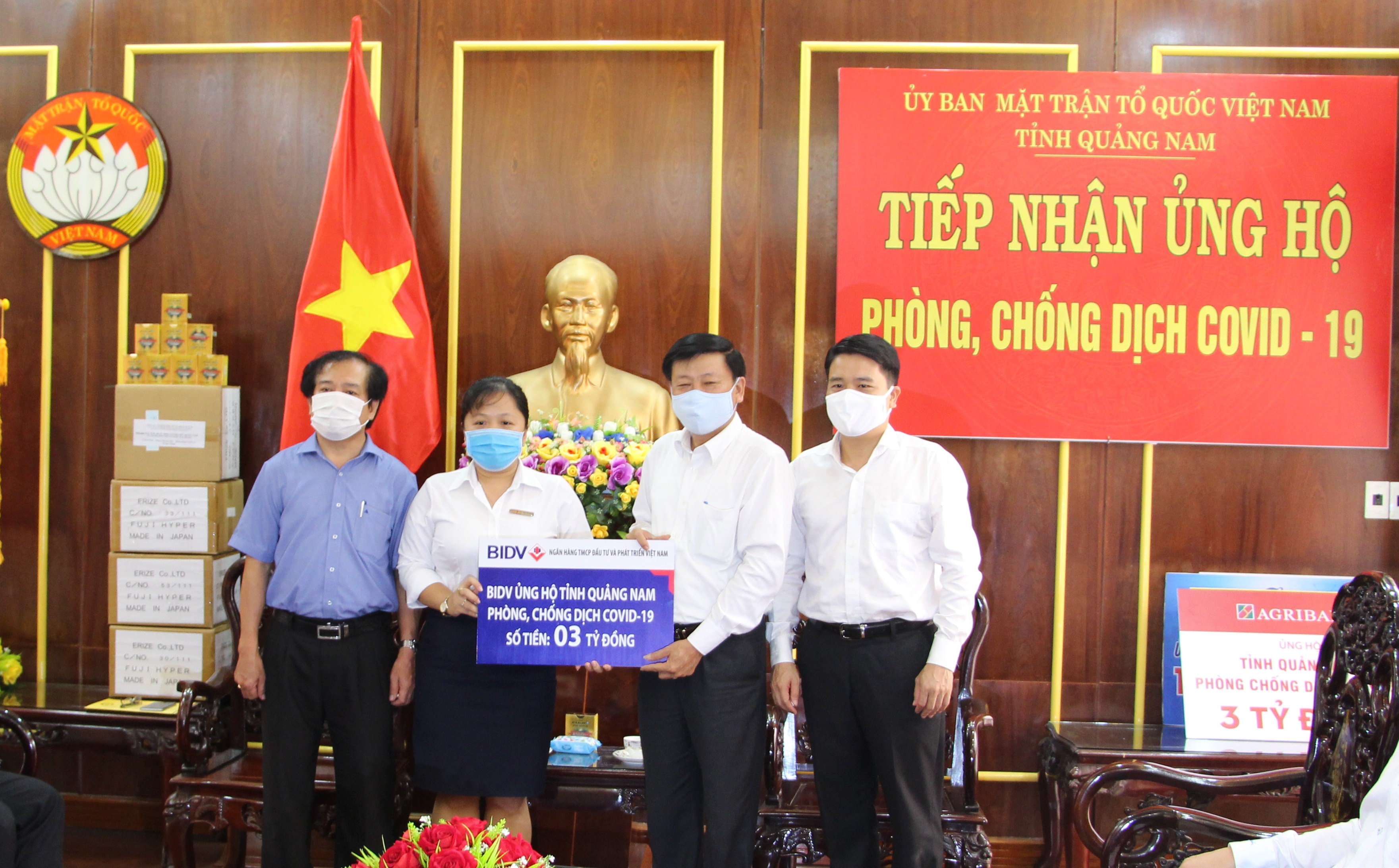 Ông Võ Xuân Ca- UVBTV, Chủ tịch Ủy ban MTTQ Việt Nam tỉnh và ông Trần Văn Tân- Phó Chủ tịch UBND tỉnh tiếp nhận và thay mặt chính quyền, nhân dân Quảng Nam ghi nhận, trân quý tình cảm mà các Ngân hàng, Doanh nghiệp đã dành cho Quảng Nam nhằm tiếp sức cùng với Đảng bộ, chính quyền và Nhân dân Quảng Nam tham gia chống dịch. Trong giai đoạn hết sức cấp bách hiện nay, các cơ sở y tế trên địa bàn tỉnh Quảng Nam đang rất cần các vật tư y tế phục vụ cho công tác phòng, chống dịch Covid-19. Vì vậy, Ủy ban MTTQ Việt Nam tỉnh là cơ quan được giao nhiệm vụ tiếp nhận ủng hộ sẽ khẩn trương phân bổ kịp thời nguồn tiền, hàng vận động đến các cơ sở y tế để phục vụ cho công tác phòng, chống dịch bệnh.