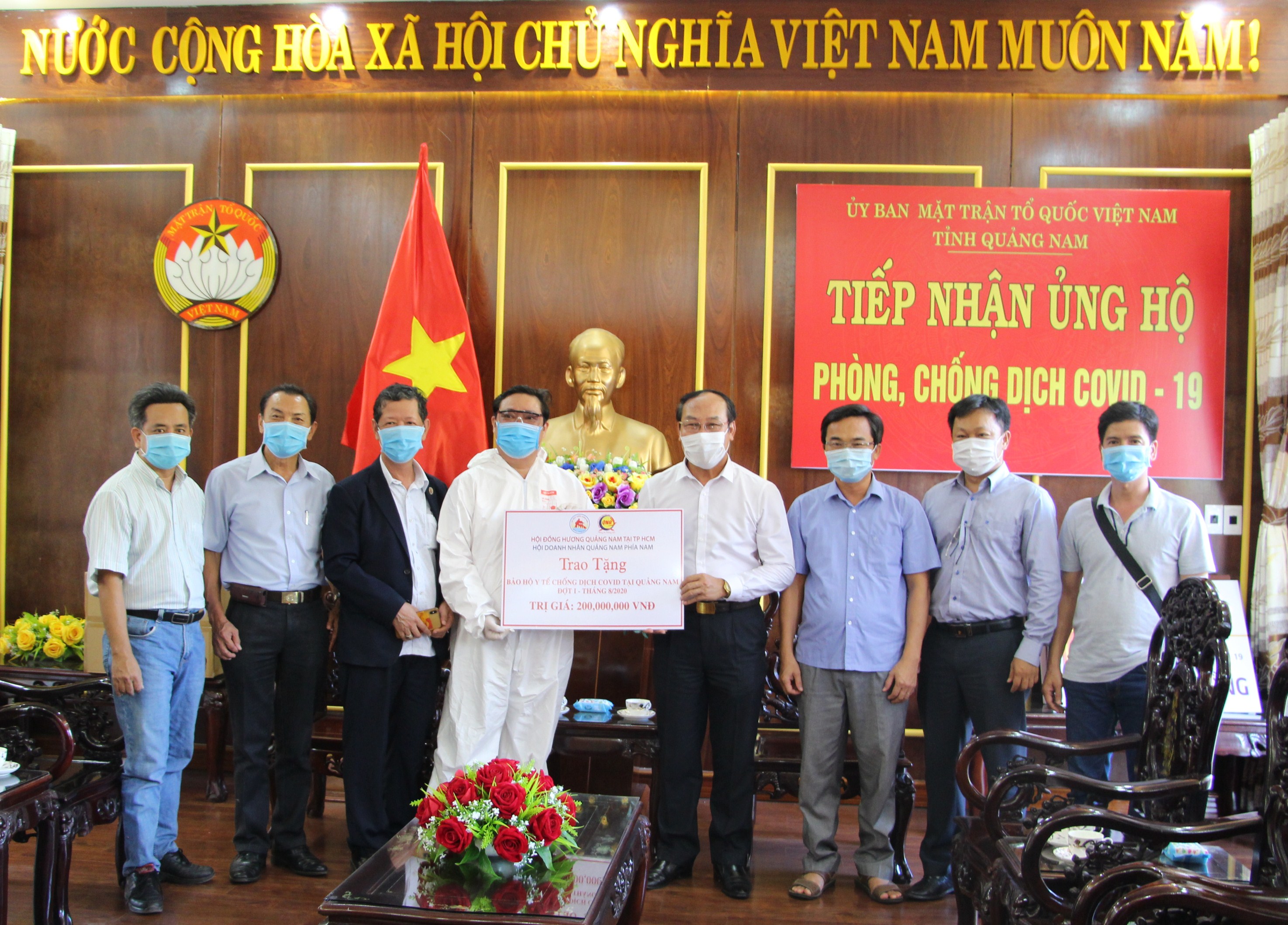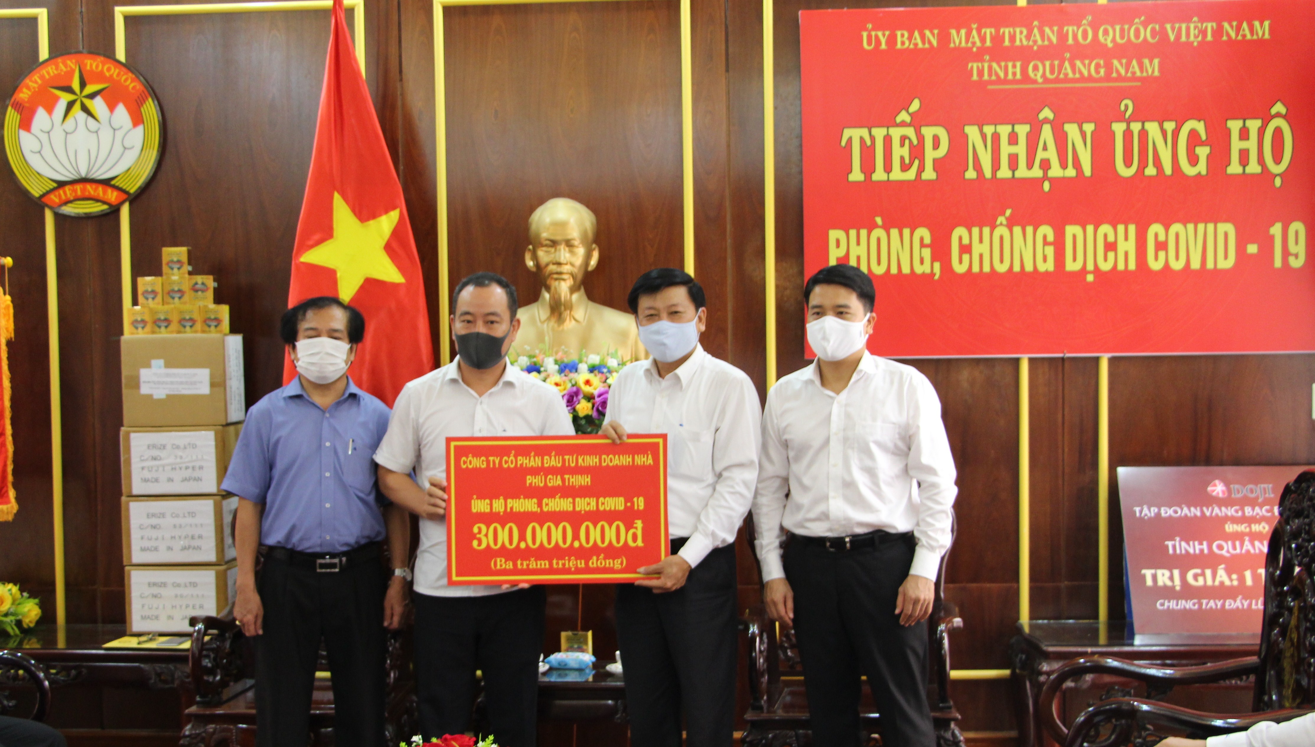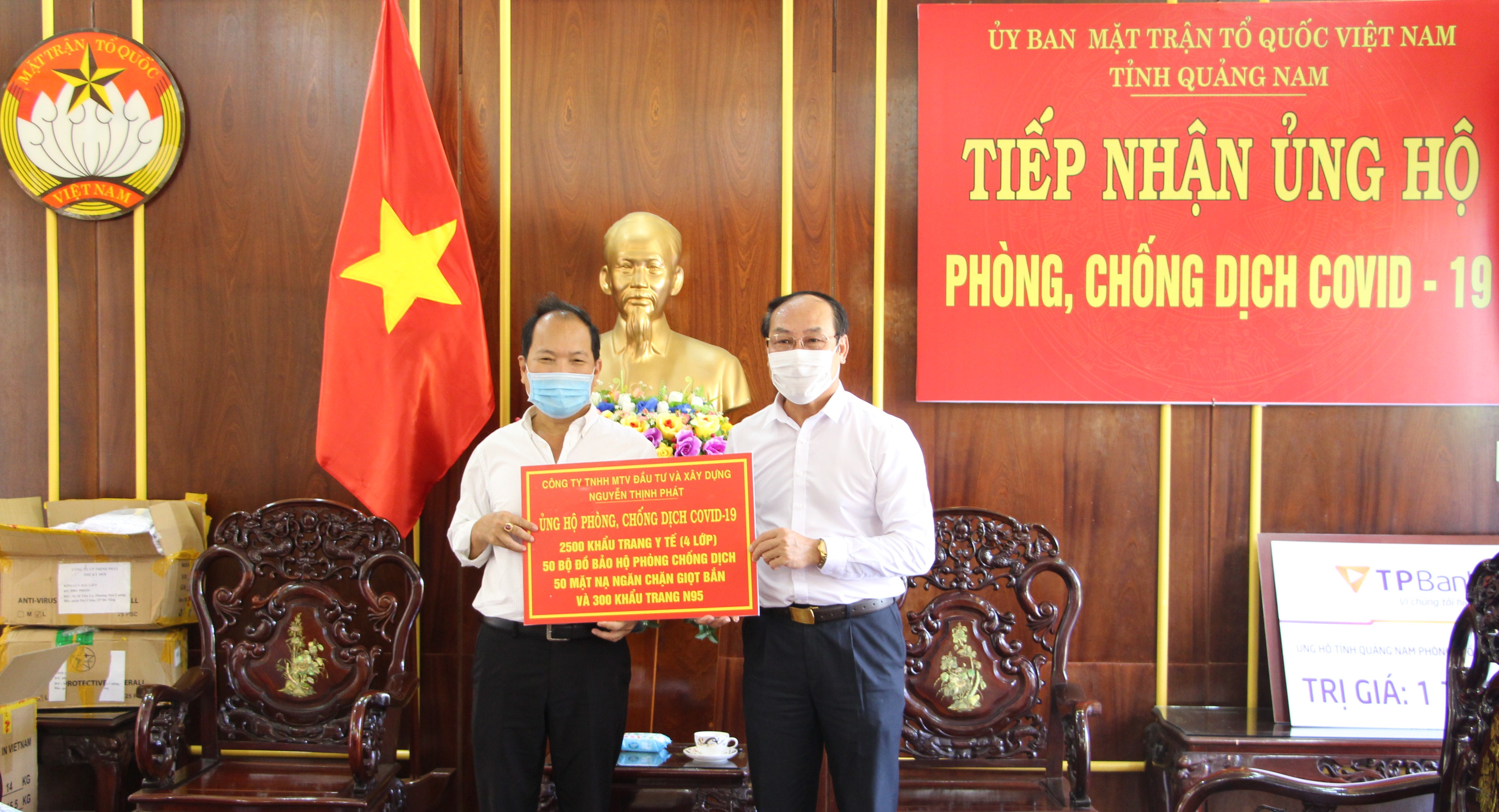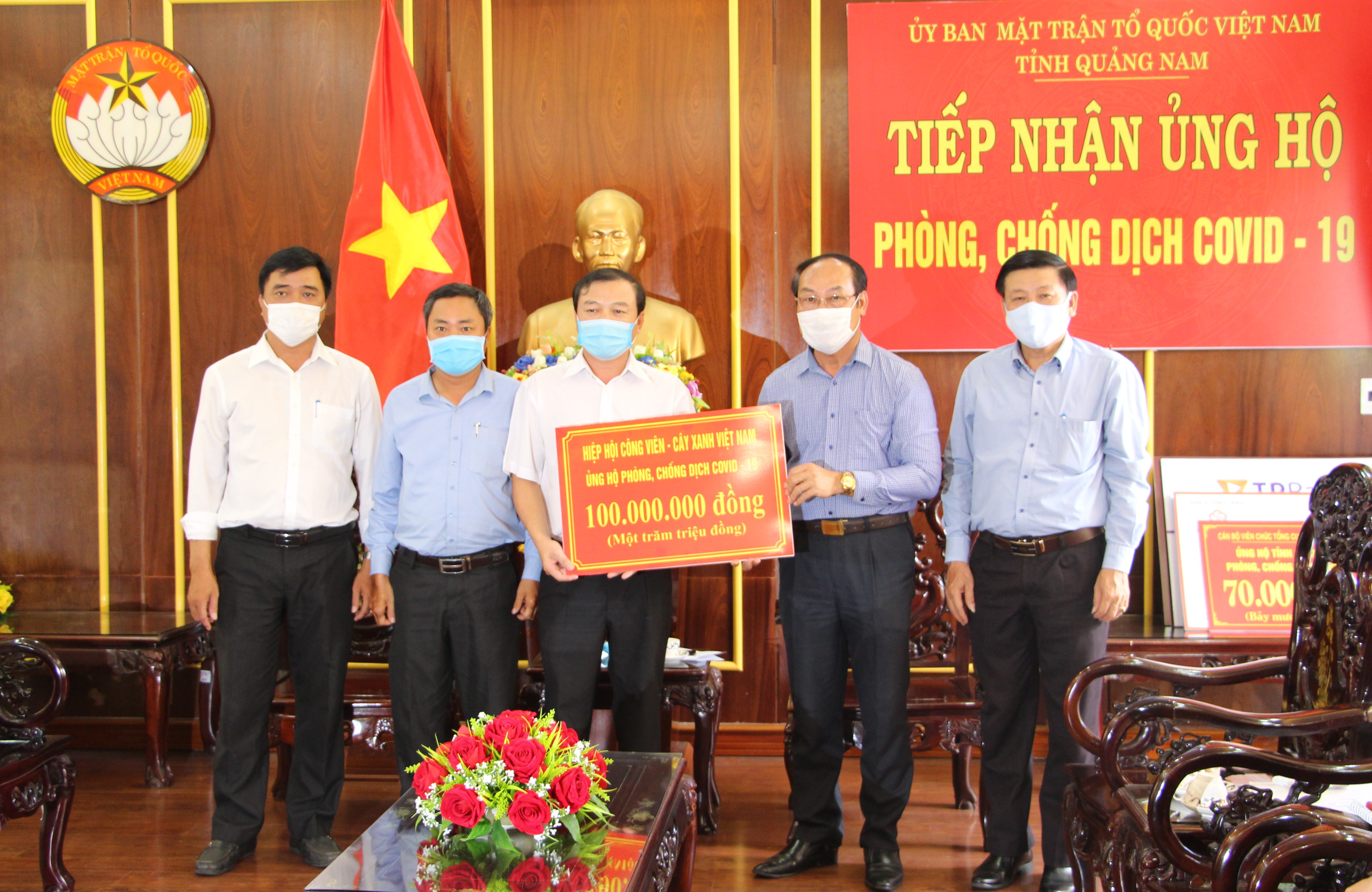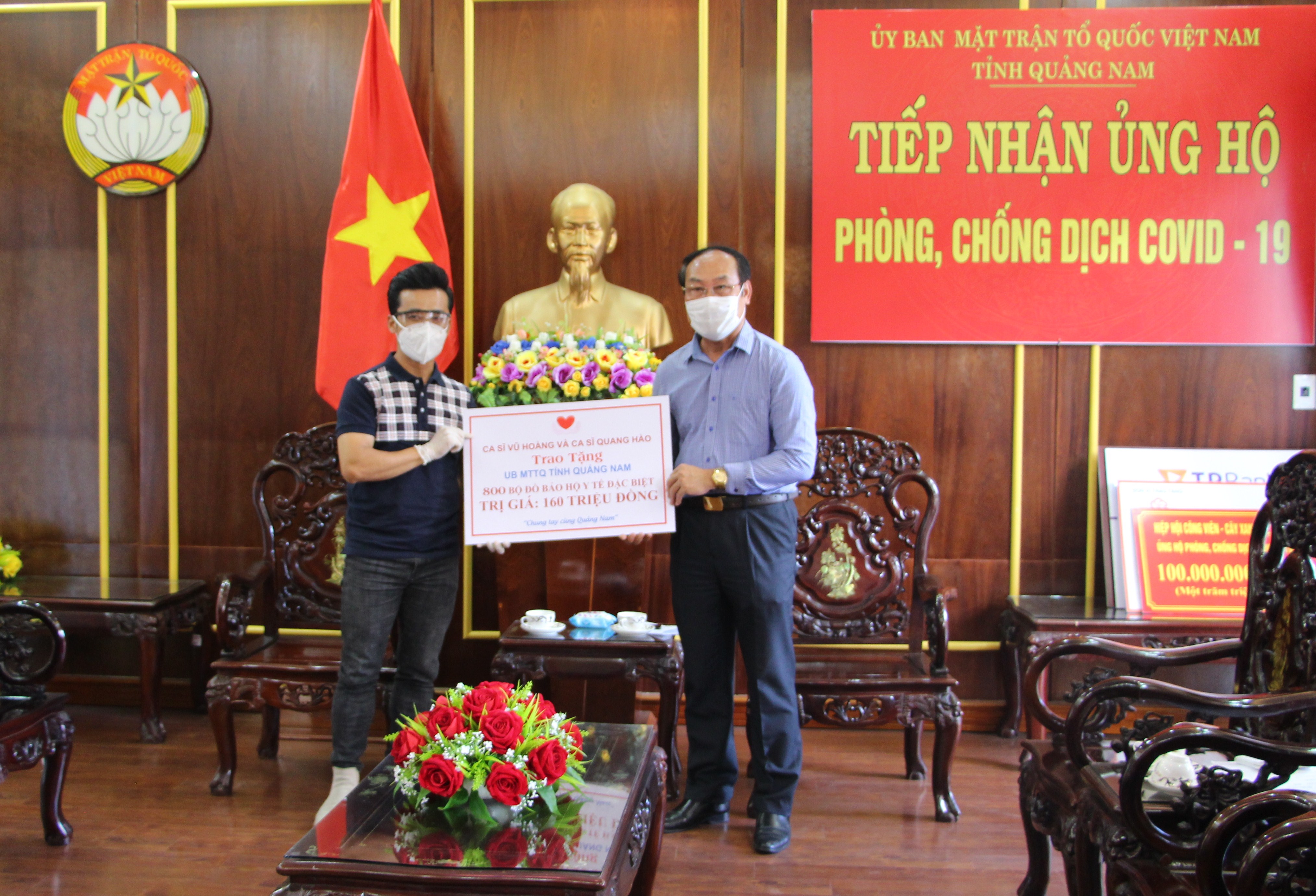 Cùng lúc này, ông Võ Xuân Ca- Chủ tịch Ủy ban MTTQ Việt Nam tỉnh cũng đã tiếp nhận 100 triệu đồng từ Hiệp hội Công viên- Cây xanh Việt Nam. 800 bộ độ bảo hộ y tế đặc biệt trị giá 160 triệu đồng của hai ca sĩ Vũ Hoàng và Quang Hào. Vợ chồng nghệ sĩ Trường Giang- Nhã Phương người con quê hương Quảng Nam ủng hộ 300 triệu đồng.