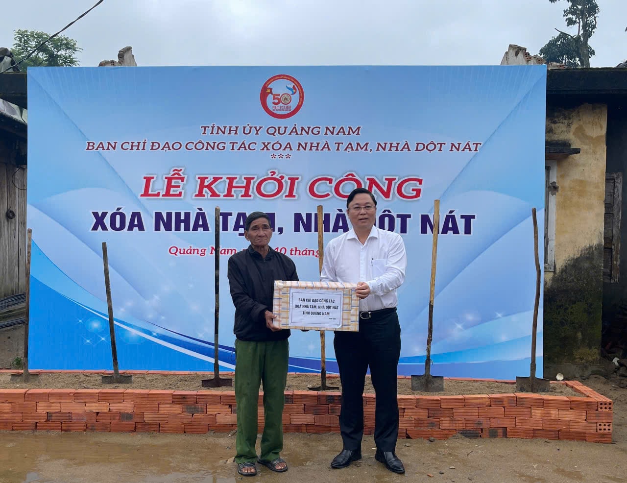 Chủ tịch Uỷ ban MTTQ Việt Nam tỉnh Lê Trí Thanh tặng quà tại Lễ khởi công xây dựng nhà ông Võ Ngọc Minh (Bắc Trà My)