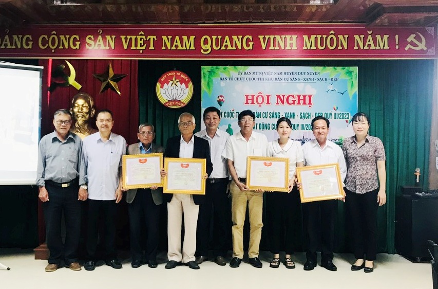 Trong Quý III/2023, có 14 khu dân cư và 28 hộ gia đình trên địa bàn 14 xã, thị trấn đủ điều kiện đăng ký tham gia đợt thi. Qua đó, Ban giám khảo đã tiến hành khảo sát và kiểm tra thực tế. Kết quả chấm chọn, Khu tái định cư Duy Hải – Giai đoạn 2, thôn Tây Sơn Đông, xã Duy Hải đạt giải nhất; khu dân cư Trà Kiệu Tây, xã Duy Sơn đạt giải nhì; hộ gia đình ông Nguyễn Minh Sơn, thôn Nhuận Sơn, xã Duy Phú và hộ gia đình ông Trần Đình Mười, thôn Thu Bồn Tây, xã Duy Tân là 2 hộ tích cực hưởng ứng, tham gia Cuộc thi và có mô hình “Nhà sạch, vườn đẹp”. Tại Hội nghị, Ban Tổ chức đã tiến hành trao giấy chứng nhận và tiền thưởng cho các khu dân cư và hộ gia đình đạt giải.