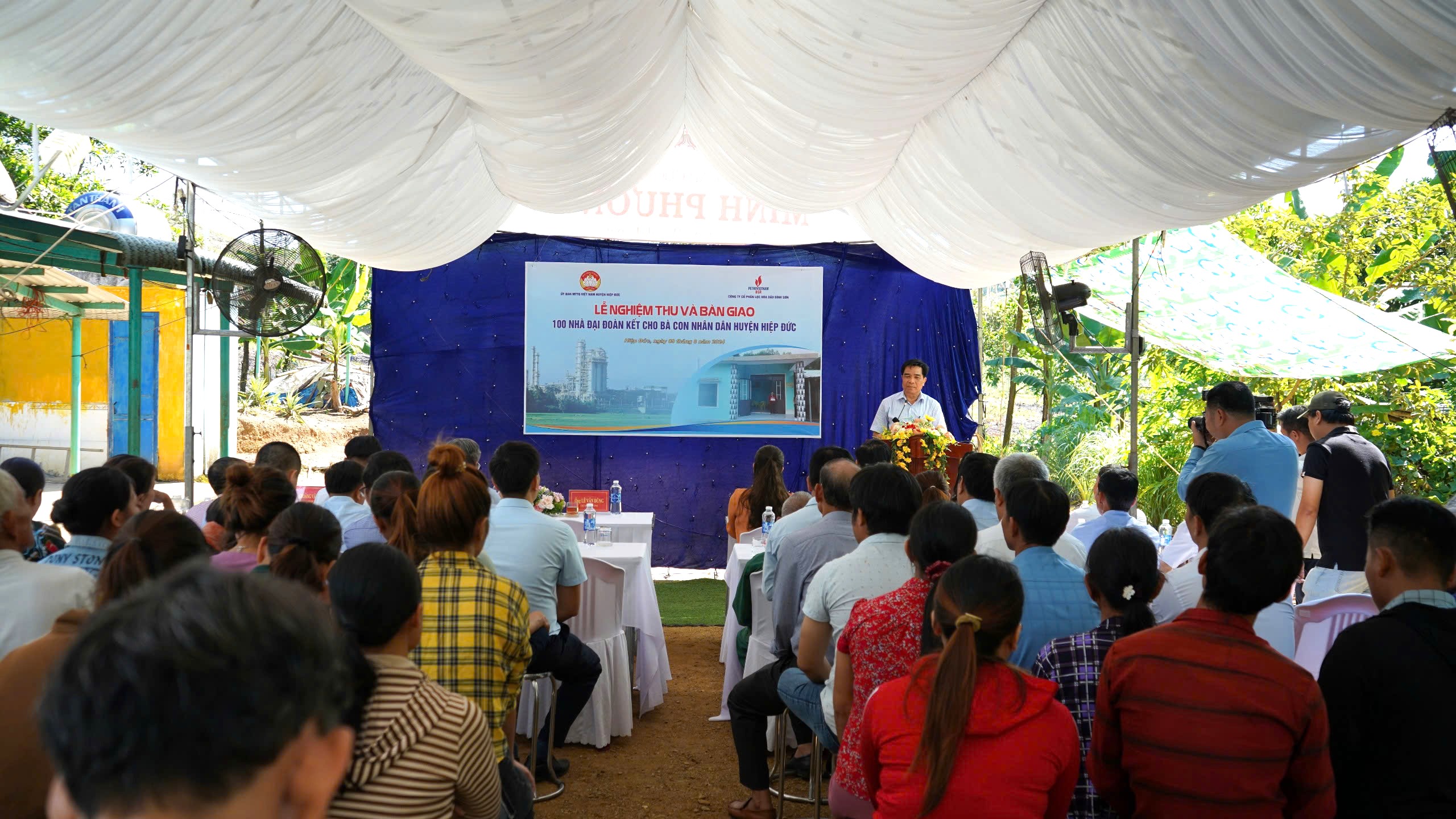 Ông Huỳnh Hữu Cường – UVBTV, Trưởng Ban Dân vận, Chủ tịch Ủy ban MTTQ Việt Nam huyện báo cáo kết quả triển khai xây dựng nhà đại đoàn kết từ nguồn hỗ trợ của Công ty lọc hóa dầu Bình Sơn – Quảng Ngãi trong dịp kỷ niệm 50 năm Ngày giải phóng Hiệp Đức (30/4/1972). Sau hơn 01 năm khởi công xây dựng, 100 ngôi nhà đã hoàn thiện, bàn giao và đưa vào sử dụng với tổng trị giá 13.239.000.000 đồng, trong đó nguồn hỗ trợ của Công ty Cổ phần Lọc hóa dầu Bình Sơn 05 tỷ đồng; Dự án Habitat 01 tỷ đồng; gia đình, tộc họ và cộng đồng 7,239 tỷ đồng.