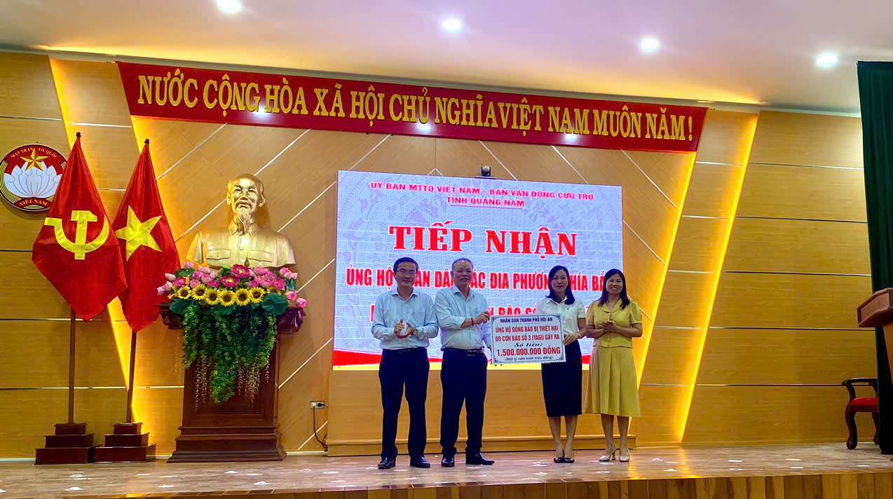 * Sáng ngày 24/9, tại cơ quan Ủy ban MTTQ Việt Nam tỉnh, Ủy ban MTTQ Việt Nam thành phố Hội An đã trao kinh phí ủng hộ các tỉnh phía Bắc số tiền 1,5 tỷ đồng. Trước đó từ các nguồn vận động Ủy ban MTTQ Việt Nam thành phố Hội An đã đi trao trực tiếp hỗ trợ cho huyện Cô Tô (Quảng Ninh) và Sa Pa (Lào Cai), mỗi địa phương 01 tỷ đồng.