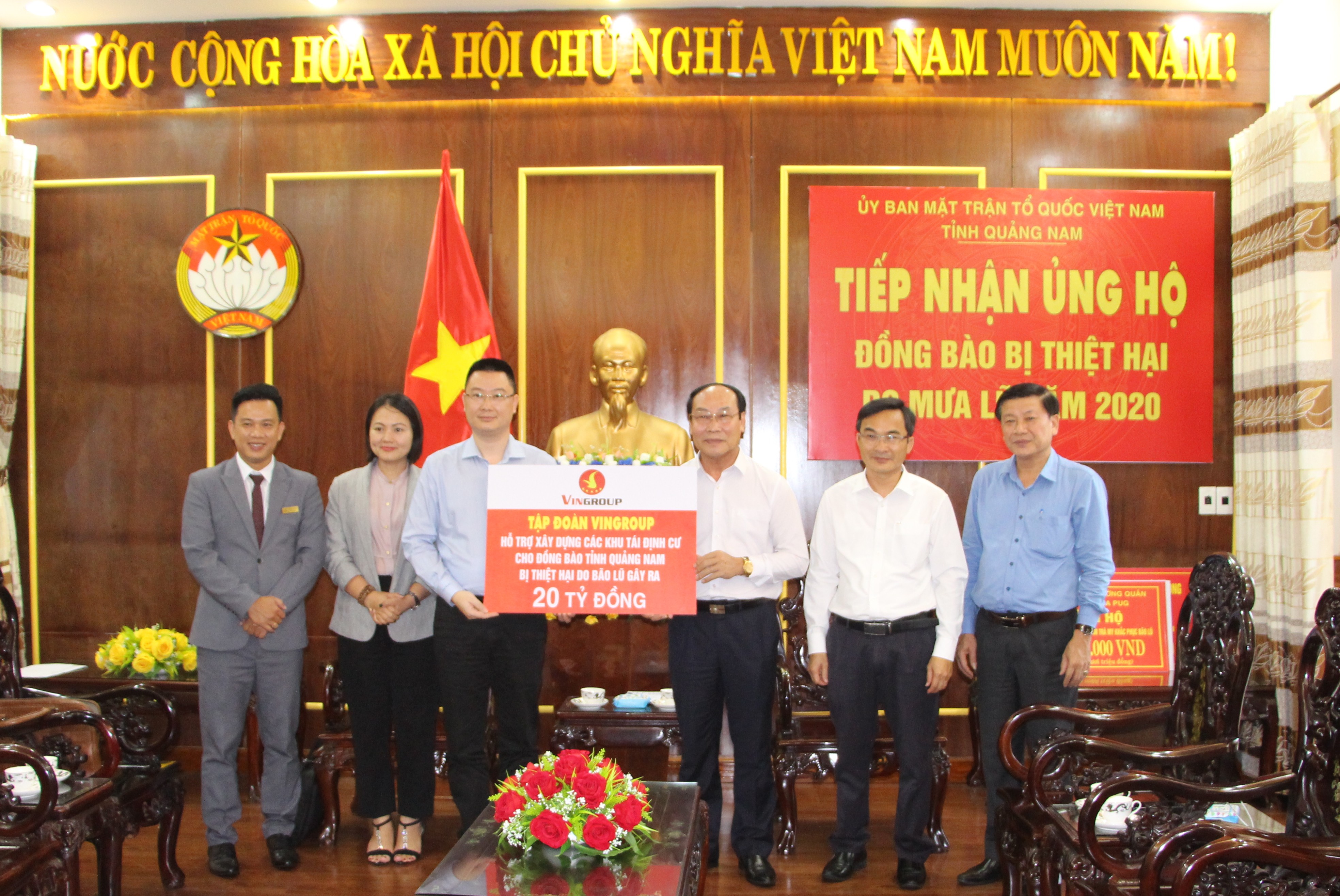 Ngày 06/11/2020, ông Lý Minh Tuấn- Giám đốc Quỹ Thiện Tâm của Tập đoàn Vingrop đến thăm Quảng Nam và trao biển ủng hộ 20 tỷ đồng để xây dựng các khu tái định cư cho đồng bào Quảng Nam bị thiệt hại do bão lũ. Ông chia sẻ: Tập đoàn Vingrop đã đồng hành cùng Quảng Nam trong công tác an sinh xã hội hơn 13 năm qua, hỗ trợ hơn 150 tỷ đồng nhằm phụng dưỡng các mẹ Việt Nam anh hùng, xây dựng trường học, trạm y tế cho các địa phương, trong đó có nhiều chương trình đã phối hợp đồng hành cùng với Ủy ban MTTQ Việt Nam tỉnh. Và năm 2020, Quảng Nam là địa phương chịu ảnh hưởng của dịch bệnh Covid-19, trong tháng qua lại liên tiếp hứng chịu bão lũ, đời sống nhân dân gặp nhiều khó khăn, đặc biệt cơn bão số 09 gây lũ quét, sạt lỡ làm chết người, cuốn trôi toàn bộ nhà cửa, tài sản của đồng bào các xã Trà Vân, xã Trà Leng (Nam Trà My), xã Phước Kim, Phước Lộc (huyện Phước Sơn). Nhằm hỗ trợ đồng bào vùng cao có chỗ ở an toàn, ổn định, Tập đoàn mong muốn thông qua kênh tiếp nhận của Mặt trận ủng hộ 20 tỷ đồng để thống nhất đầu mối, tập trung nhiều nguồn lực cùng với chính quyền xây dựng các khu tái định cư cho đồng bào miền núi Quảng Nam.