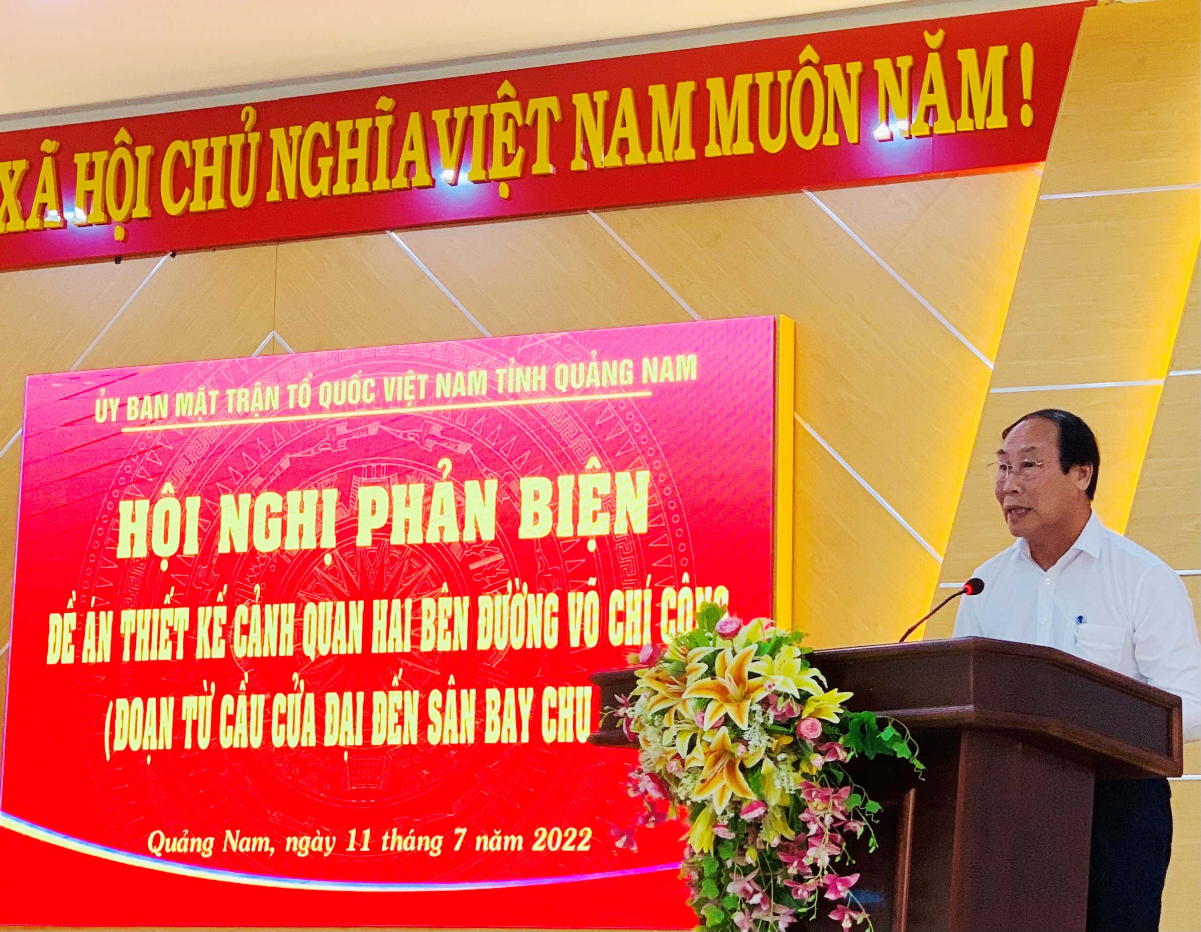 Hội nghị được nghe đại diện cơ quan chủ trì soạn thảo trình bày một số nội dung cơ bản của Đề án; và những nội dung gợi ý trọng tâm được nhấn mạnh cần tham gia thảo luận của đồng chí chủ trì; trên cơ sở đó, với tinh thần thẳng thắn, xây dựng, các đại biểu tham dự hội nghị đánh giá cao về mục đích, ý nghĩa của việc tổ chức hội nghị phản biện xã hội này, tập trung trao đổi, thảo luận, tham gia nhiều ý kiến vào dự thảo của Đề án, trong đó tập trung một số nội dung chính nhằm đóng góp ý tưởng để hoàn thiện Thiết kế cảnh quan hai bên đường Võ Chí Công (đoạn từ cầu Cửa Đại đến sân bay Chu Lai) như về tầm nhìn, định hướng phát triển cảnh quan hai bên đường Võ Chí Công trong định hướng phát triển vùng Đông Quảng Nam và dãi ven biển, hướng đến phát triển du lịch xanh, đô thị và công nghiệp sinh thái; Các ý tưởng xây dựng Đại lộ Võ Chí Công bảo đảm tính phù hợp với kiến trúc không gian, kiến trúc cảnh quan đô thị tương lai của tỉnh, trở thành trục cảnh quan ven biển tiêu biểu của tỉnh Quảng Nam, là biểu tượng mới về văn hóa và phát huy giá trị kinh tế, gồm: Nhận diện các đặc trưng và phân vùng cảnh quan trên toàn tuyến; Các yếu tố truyền thống, các đặc trưng có thể khai thác để tạo nên đặc trưng riêng của Quảng Nam; Ý tưởng về các công trình biểu tượng, điểm nhấn, cửa ngõ trên toàn tuyến và cho từng đô thị, khu chức năng cụ thể và tính khả thi của phương án thiết kế; phương thức triển khai thực hiện.