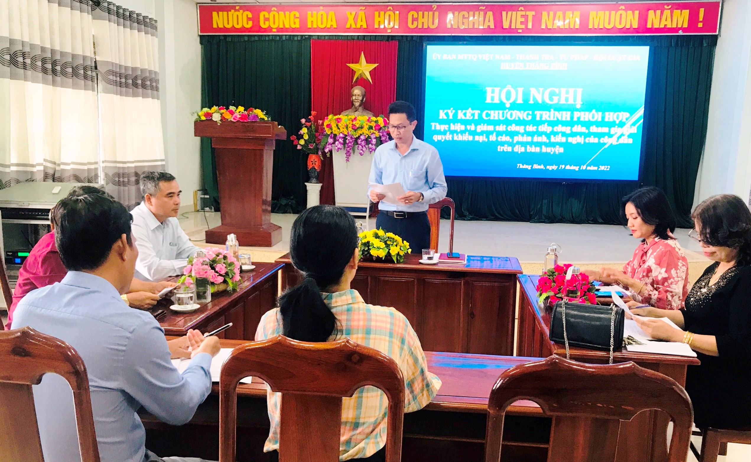 Tham dự buổi làm việc có ông Nguyễn Thanh Phong, UVBTV, Chủ tịch Ủy ban MTTQ Việt Nam huyện, đại diện Ban Thường trực Ủy ban MTTQ Việt Nam huyện; ông Võ Tiến Dũng - Chánh Thanh tra huyện; bà Bùi Thị Trang - Trưởng phòng Tư pháp và bà Trần Thị Tiền - Chủ tịch Hội Luật gia huyện.