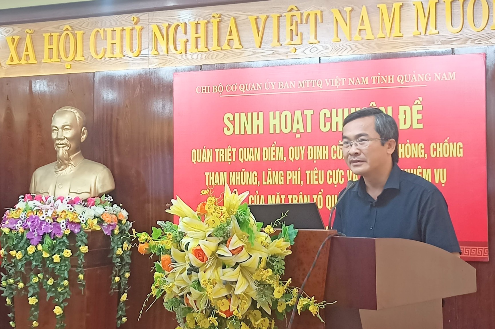 Đồng chí Nguyễn Phi Hùng - Bí thư chi bộ, Phó Chủ tịch thường trực Ủy ban MTTQ Việt Nam tỉnh chủ trì và trực tiếp quán triệt nội dung trên. Tại hội nghị, các quan điểm cơ bản của Đảng về phòng chống tham nhũng, tiêu cực tại Nghị quyết Đại hội XIII; Nghị quyết 23-NQ/TU ngày 25/4/2022 của Tỉnh ủy Quảng Nam về nâng cao chất lượng, hiệu quả công tác phòng, chống tham nhũng, lãng phí, tiêu cực trên địa bàn tỉnh đến năm 2025, định hướng đến năm 2030; Thông báo kết luận số 12-TB/TW, ngày 06/4/2022 của Bộ Chính trị về tiếp tục tăng cừờng sự lãnh đạo của Đảng đối với công tác phòng, chống tham nhũng, tiêu cực được đồng chí Bí thư chi bộ tập trung quán triệt, phân tích, làm rõ để các đảng viên chi bộ nhận thức sâu sắc, đầy đủ hơn về nhiệm vụ đặc biệt quan trọng của công tác phòng chống tham nhũng, tiêu cực trong giai đoạn hiện nay.