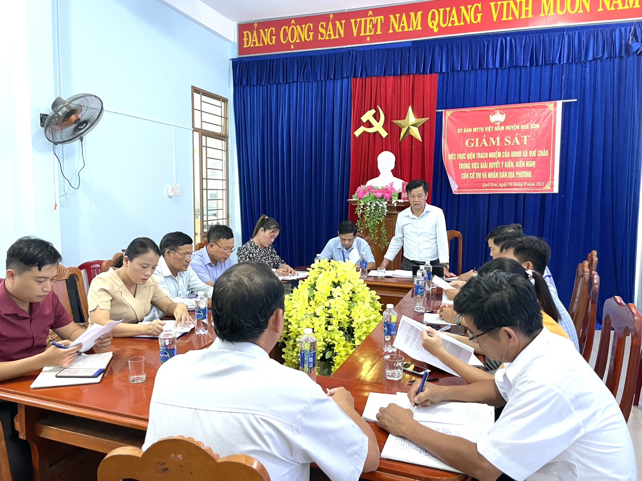 Đoàn giám sát đã nghe đại diện lãnh đạo UBND xã Quế Châu báo cáo kết quả thực hiện trách nhiệm của UBND xã trong việc giải quyết ý kiến, kiến nghị của cử tri và Nhân dân trên địa bàn xã từ ngày 01/01/2022 đến tháng 6/2023. Cụ thể: có 125 ý kiến, kiến nghị, trong đó: 11 ý kiến, kiến nghị thuộc lĩnh vực về điện; giao thông: 28 ý kiến; thủy lợi: 30 ý kiến; quản lý đất đai và tài nguyên môi trường: 21 ý kiến; lĩnh vực khác: 35 ý kiến; đã tiếp thu, giải quyết, trả lời tại hội nghị 27/125 ý kiến và trả lời bằng văn bản 98/125 ý kiến, tổng số ý kiến trả lời 125/125 ý kiến, đạt 100%.