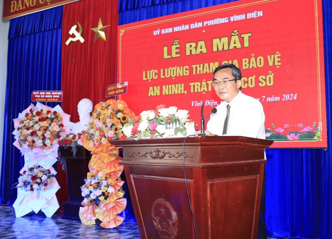 Thay mặt Ban Chỉ đạo 138 tỉnh, ông Nguyễn Phi Hùng, Phó Chủ tịch Thường trực Ủy ban MTTQ Việt Nam tỉnh ghi nhận sự tích cực triển khai thực hiện Luật Lực lượng tham gia bảo vệ an ninh, trật tự ở cơ sở và chúc mừng sự ra đời chính thức của lực lượng tham gia bảo vệ ANTT ở cơ sở của phường Vĩnh Điện thị xã Điện Bàn. Đồng thời nhấn mạnh: Đối với thị xã Điện Bàn, trong những năm đến, ngày càng có vị trí quan trọng trong quy hoạch tổng thể phát triển kinh tế - xã hội của tỉnh, giữ vai trò động lực phát triển của khu vực phía Bắc tỉnh Quảng Nam. Đặc biệt, với mục tiêu phấn đấu xây dựng Điện Bàn trở thành thành phố đạt chuẩn đô thị loại III trước năm 2030 - là đô thị phát triển công nghiệp, khoa học, đổi mới sáng tạo.… sẽ tạo ra nhiều cơ hội thuận lợi cho sự phát triển kinh tế - xã hội đồng thời đặt ra nhiều khó khăn, thách thức mới đối với Đảng bộ, chính quyền và Nhân dân Điện Bàn, nhất là công tác bảo đảm ổn định chính trị, trật tự, an toàn xã hội tại địa phương.