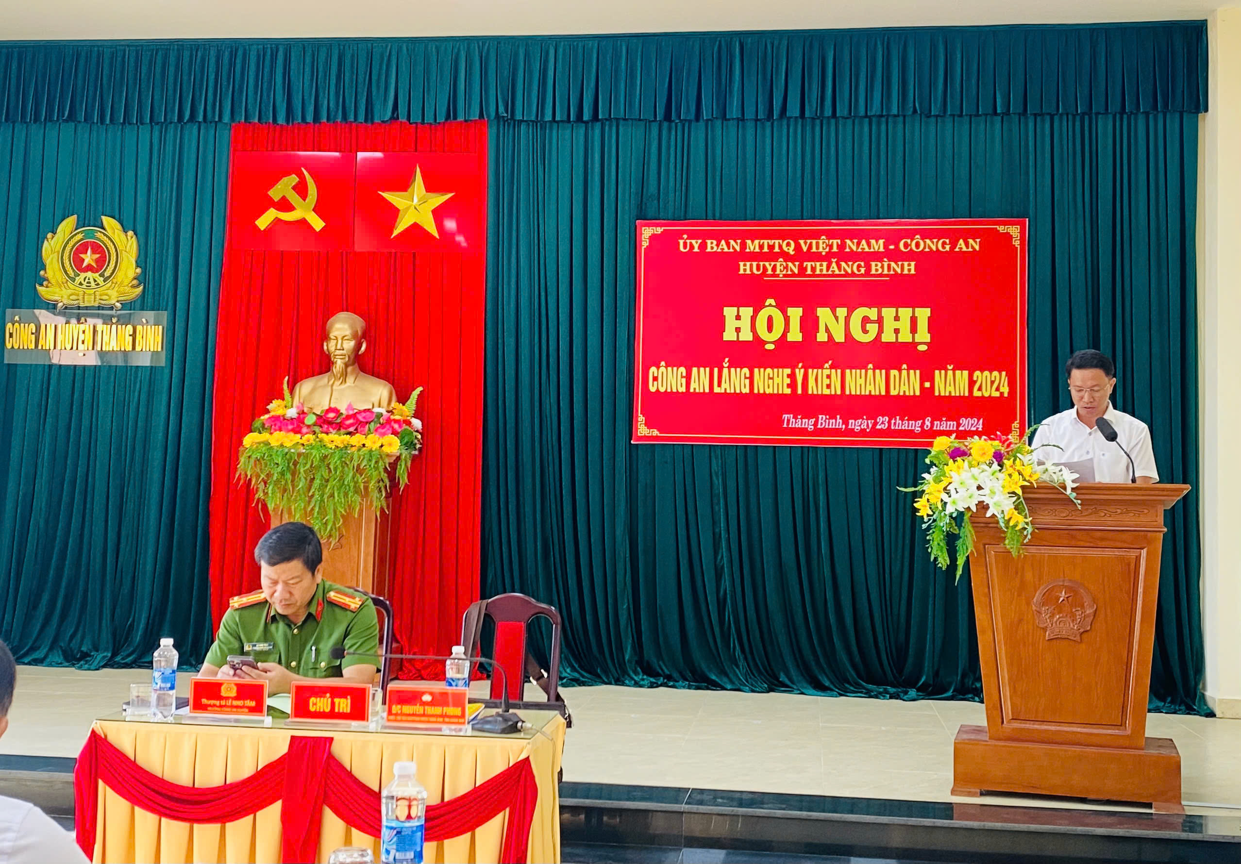 Phát biểu chỉ đạo tại hội nghị, ông Lê Quang Hạt - Phó Bí thư Thường trực Huyện ủy ghi nhận và đánh giá cao kết quả công tác trong thời gian qua của lực lượng Công an huyện; đề nghị trong thời gian đến, lực lượng công an tiếp tục phát huy tinh thần, trách nhiệm, năng lực, nâng cao chất lượng, hiệu quả công tác tuần tra, kiểm tra và xử lý, trấn áp tội phạm; MTTQ Việt Nam và các tổ chức chính trị - xã hội các cấp tiếp tục làm tốt công tác thông tin, tuyên truyền, phối hợp tổ chức tốt các hội nghị “Công an lắng nghe ý kiến Nhân dân” để hội nghị thực sự là kênh thông tin hiệu quả về tình hình an ninh chính trị, trật tự an toàn xã hội tại địa phương cũng như góp ý xây dựng lực lượng công an ngày càng trong sạch, vững mạnh, chính quy, tinh nhuệ, hiện đại, xứng đáng là người chiến sĩ Công an nhân dân vì nước quên thân, vì dân phục vụ; chung tay cùng cấp ủy, chính quyền thực hiện thắng lợi các mục tiêu phát triển kinh tế - xã hội, bảo đảm quốc phòng, an ninh trên địa bàn huyện./.