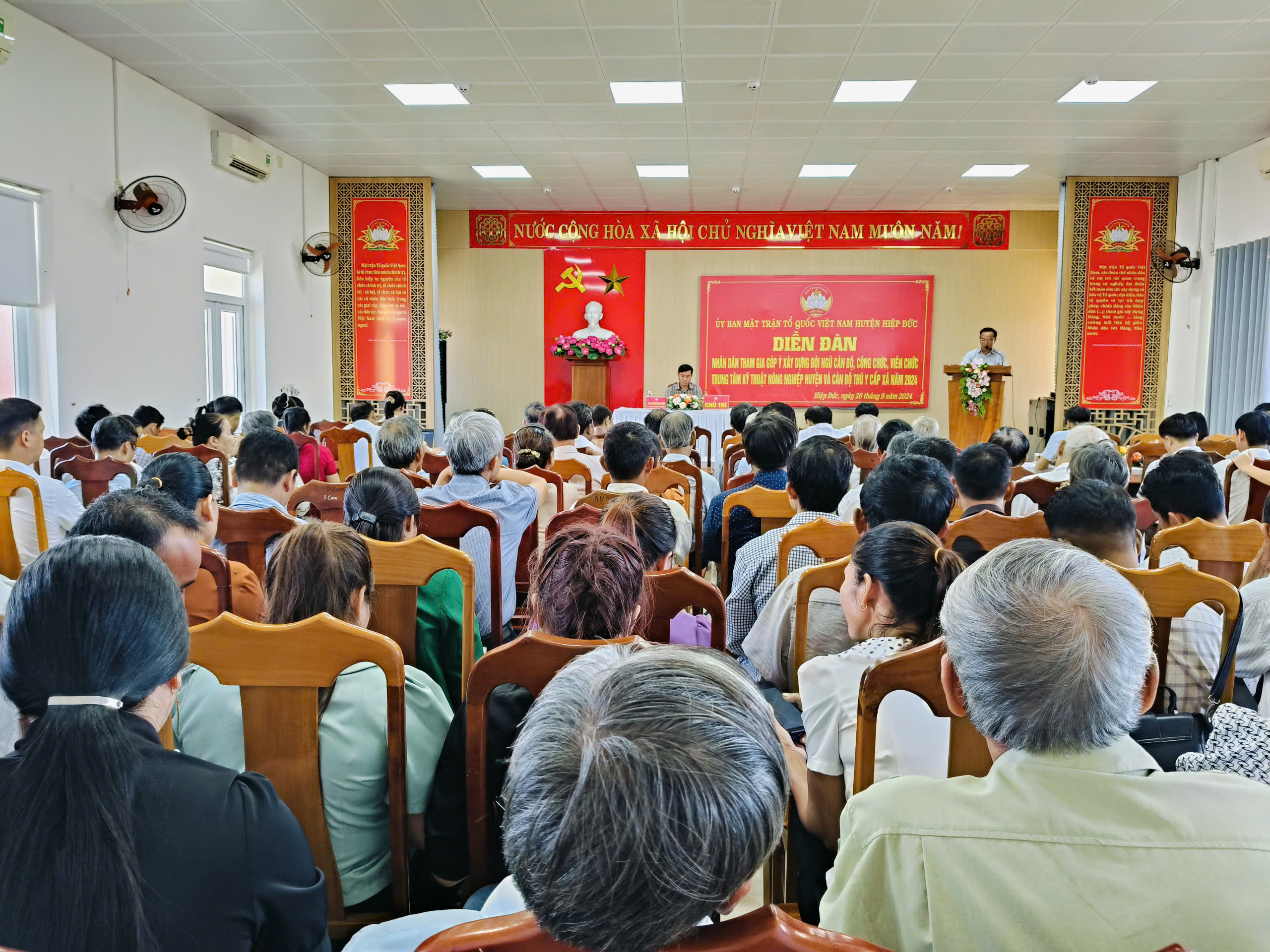 Thực hiện Chương trình công tác của Ủy ban MTTQ Việt Nam huyện Hiệp Đức năm 2024 về tham gia góp ý xây dựng Đảng, xây dựng chính quyền. Sáng ngày 26/9/2024, Ban Thường trực Ủy ban MTTQ Việt Nam huyện tổ chức Diễn đàn Nhân dân tham gia góp ý xây đội ngũ cán bộ, công chức, viên chức Trung tâm kỹ thuật nông nghiệp huyện và cán bộ Thú y cấp xã năm 2024.