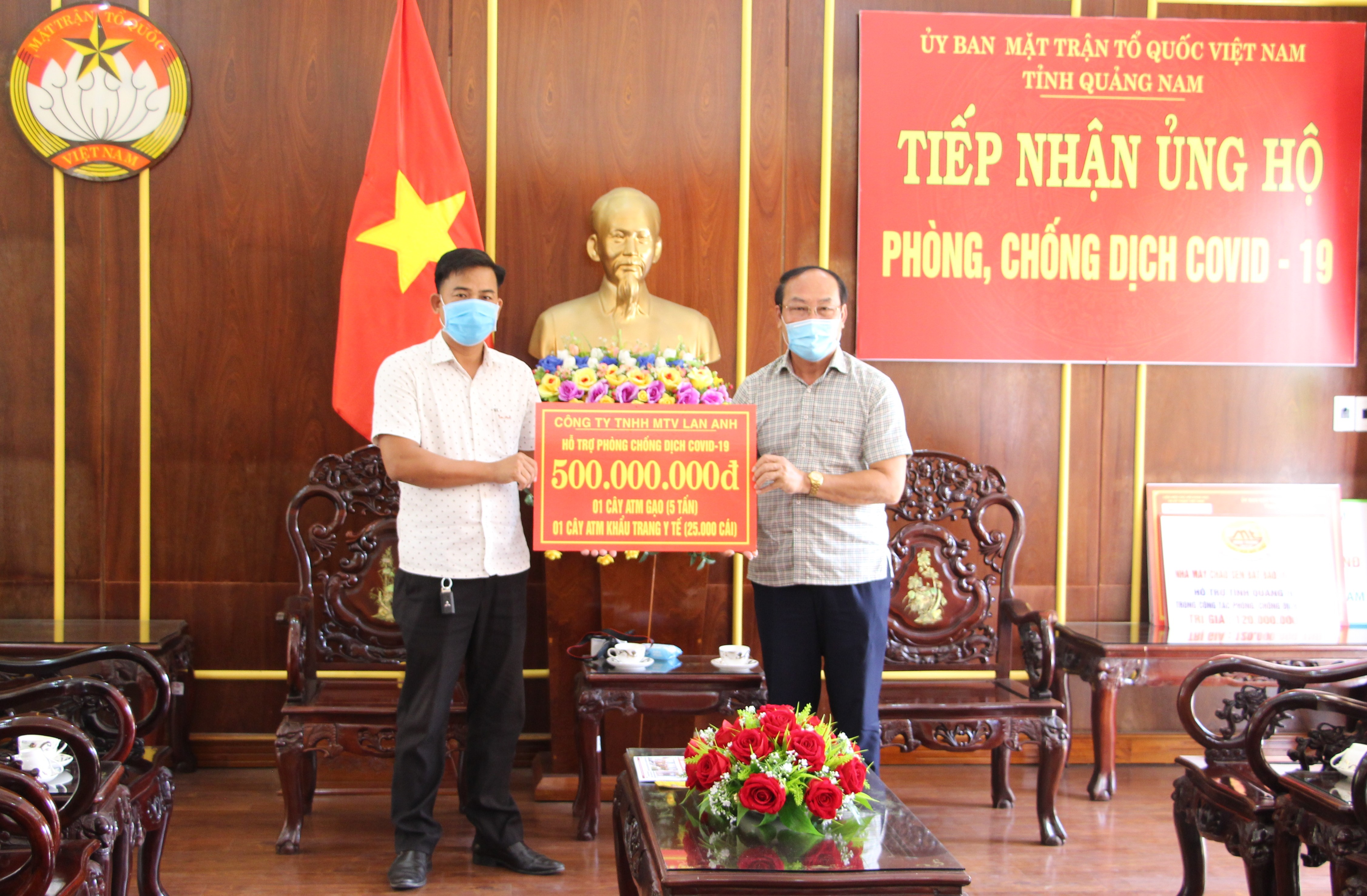 Ngày 03/9/2020, Ban Thường trực Ủy ban MTTQ Việt Nam tỉnh tiếp nhận 500 triệu đồng tiền mặt và 01 cây ATM gạo (5 tấn), 01 cây ATM khẩu trang (25.000 cái) của Công ty TNHH MTV Lan Anh; 8000 suất cháo sen Bát bảo (trị giá tương đương 120 triệu đồng) của Công ty Minh Trung ủng hộ Quảng Nam phòng, chống dịch Covid-19.