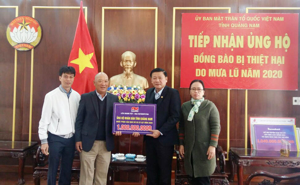Sáng ngày 12/01, đại diện lãnh đạo Liên doanh Việt - Nga VIETSOVPETRO đến trao 1 tỷ đồng ủng hộ đồng bào Quảng Nam bị thiệt hại trong cơn bão lũ. Tiếp đoàn có ông Lê Thái Bình- Phó Chủ tịch Ủy ban MTTQ Việt Nam tỉnh Quảng Nam.