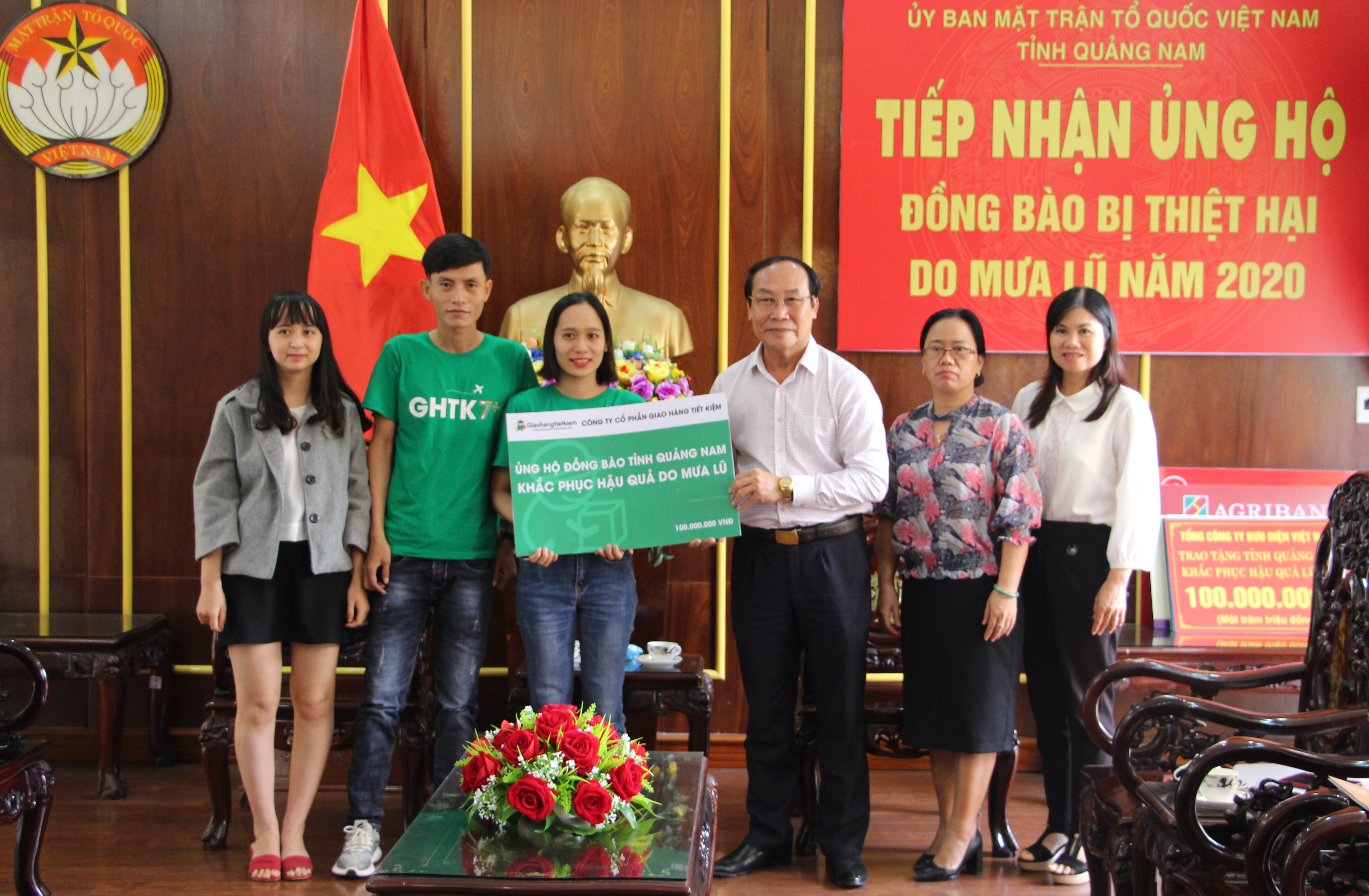 Ngày 21/10/2020, ông Võ Xuân Ca- UVBTV Tỉnh ủy, Chủ tịch Ủy ban MTTQ Việt Nam tỉnh tiếp nhận số tiền 300 triệu đồng từ Tổng công ty Bưu điện Việt Nam (100 triệu), Công ty CP Giao hàng tiết kiệm (100 triệu), Bảo hiểm Ngân hàng Agribank (100 triệu) chung sức cùng đồng bào Quảng Nam khắc phục thiệt hại bão lụt. Tiếp nhận tiền ủng hộ, ông Võ Xuân Ca thay mặt đồng bào Quảng Nam cảm ơn những tình cảm quý báu của Lãnh đạo và cán bộ công nhân viên các Công ty. Với trách nhiệm của mình, Ủy ban MTTQ Việt Nam tỉnh sẽ nhanh chóng phân bổ tiền vận động một cách công khai, minh bạch, đến với người dân bị ảnh hưởng trong thời gian sớm nhất.
