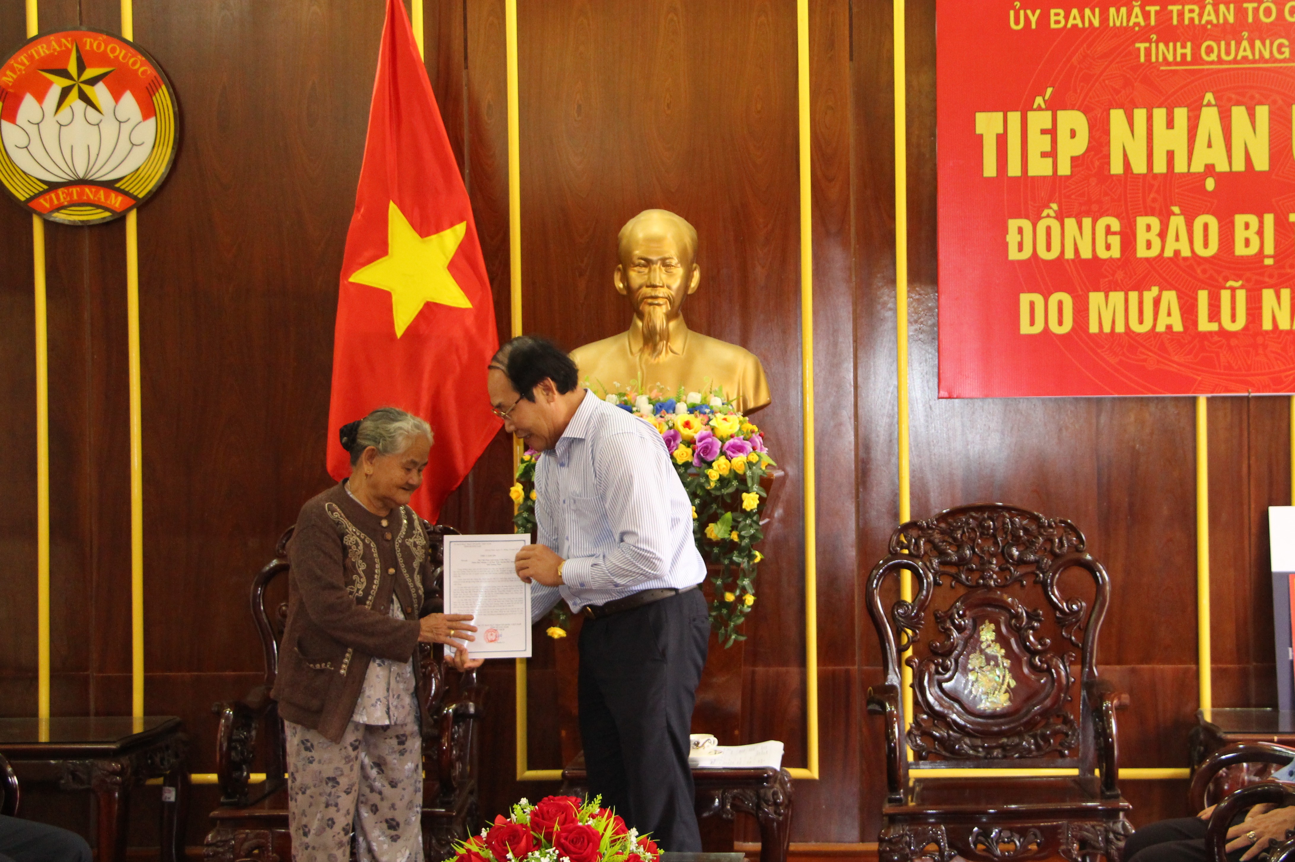 Đón nhận tình cảm của Mẹ, ông Võ Xuân Ca- Chủ tịch Ủy ban MTTQ Việt Nam tỉnh trân trọng trao Thư cảm ơn để ghi nhận tấm lòng cao quý của Mẹ, Chủ tịch Ủy ban MTTQ Việt Nam tỉnh xin hứa sẽ nhanh chóng chuyển số tiền của Mẹ đến với bà con vùng bị thiệt hại. Chúc mẹ sống lâu, sống khỏe luôn là tấm gương sáng cho con cháu noi theo.