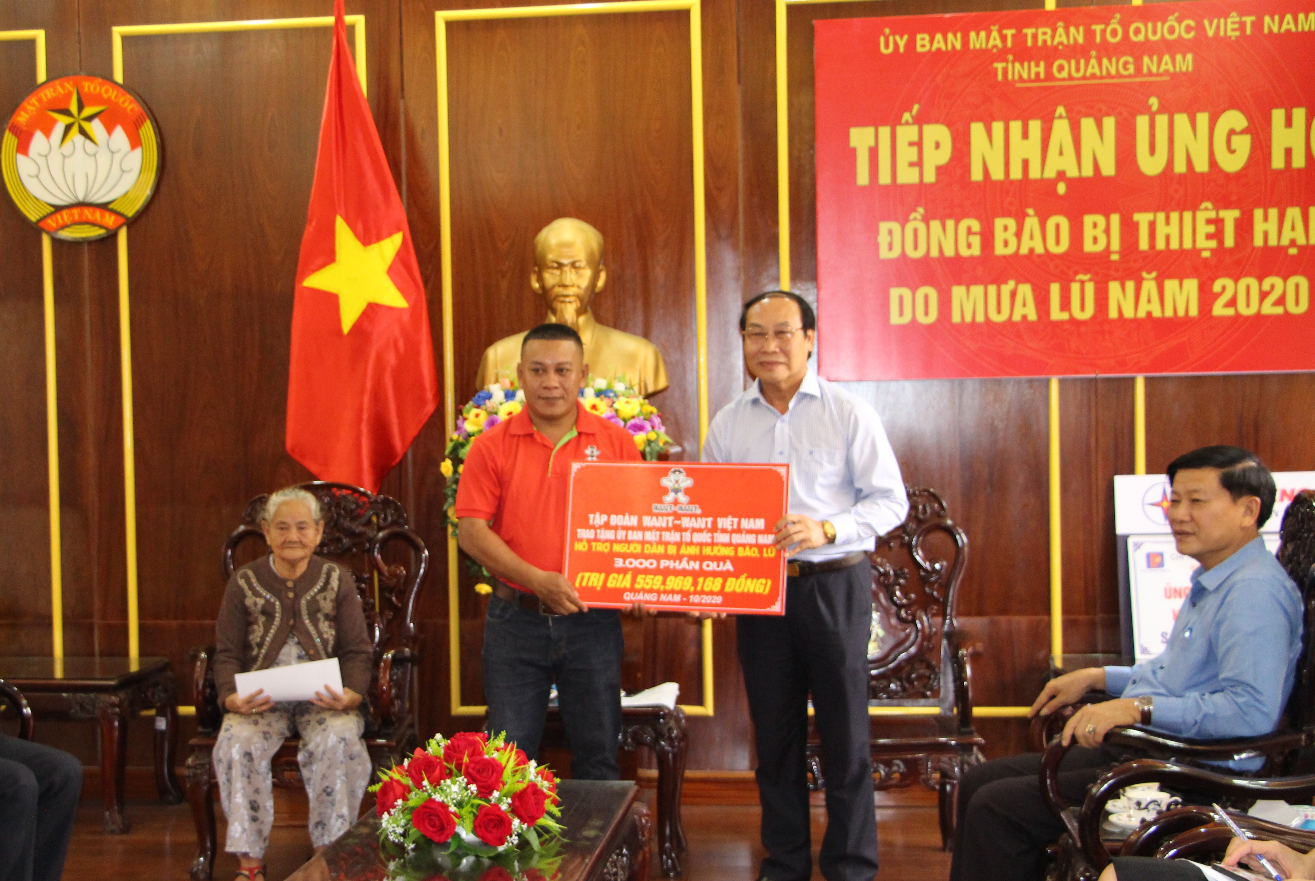 Ngày 16/10/2020, Công ty TNHH Bia CARLSBERG Việt Nam nhãn hàng Bia HUDA và Công ty In - Phát hành sách & Thiết bị Trường học Quảng Nam, Công ty Cổ phần Đất xanh Miền Trung, Công ty Cổ phần Đầu tư và Xây dựng Xuân Phú Hải và Tập đoàn Tuần Châu đến thăm và trao tiền, quà ủng hộ cho đồng bào Quảng Nam bị thiệt hại trong cơn lũ. Ông Nguyễn Phi Hùng - Phó Chủ tịch Thường trực Ủy ban MTTQ Việt Nam tỉnh; Ông Lê Thái Bình - Phó Chủ tịch Ủy ban MTTQ Việt Nam tỉnh, Phó Trưởng ban Cứu trợ tỉnh và các ông, bà trong Ban Thường trực Ủy ban MTTQ Việt Nam tỉnh đón tiếp đoàn.