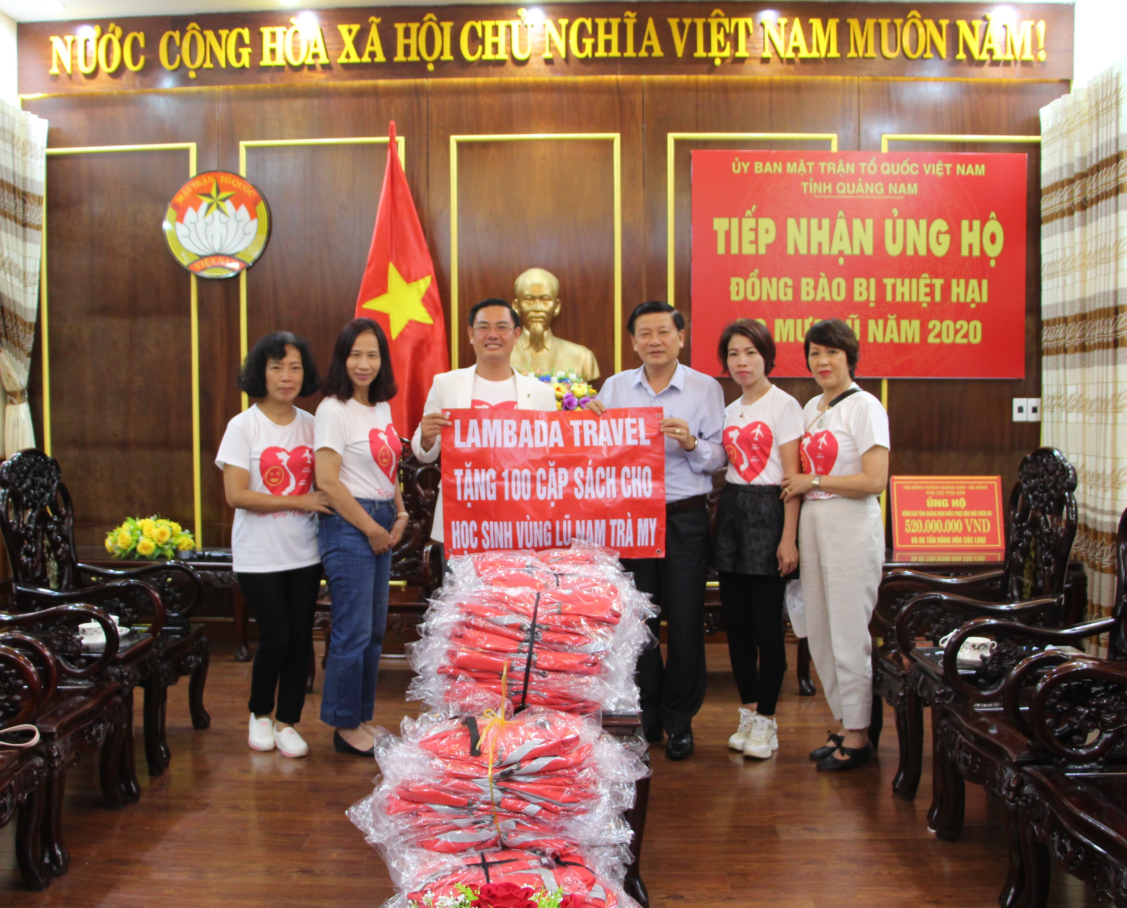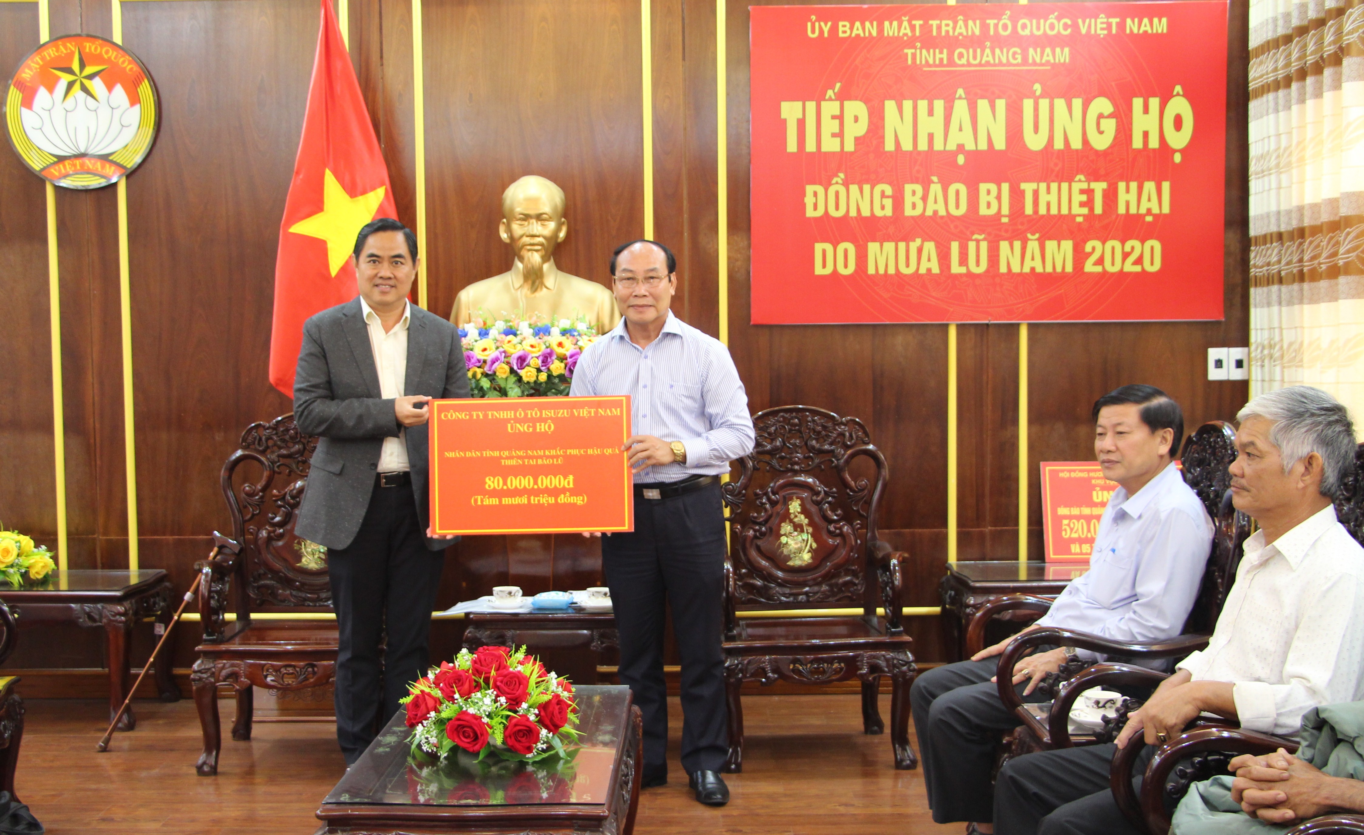 Cùng ngày, Ban Thường trực Ủy ban MTTQ Việt Nam tỉnh tiếp nhận số tiền ủng hộ 80 triệu đồng của Công ty TNHH Ô tô ISUZU Việt Nam và 100 cặp sách cho học sinh huyện Nam Trà My của Công ty Lambada Travel