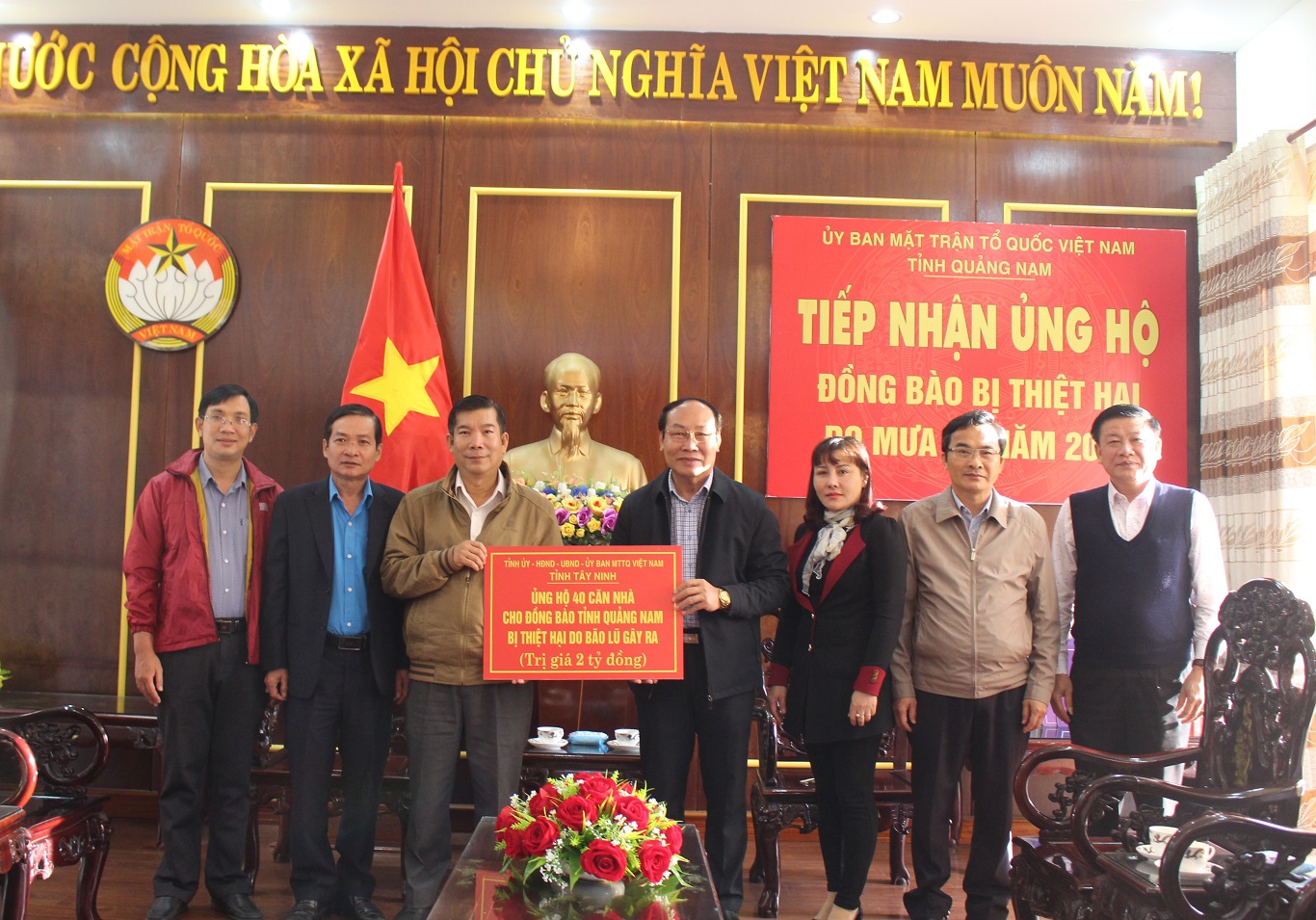 Sáng 15/1, Đoàn công tác của tỉnh Tây Ninh, do ông Nguyễn Văn Vy, Phó Chủ tịch Ủy ban MTTQ Việt Nam tỉnh làm trưởng đoàn đã đến thăm hỏi và ủng hộ 40 căn nhà, trị giá 2 tỷ đồng cho đồng bào tỉnh Quảng Nam bị thiệt hại do bão lũ gây ra. Tiếp đoàn có, ông Võ Xuân Ca, Chủ tịch Ủy ban MTTQ Việt Nam tỉnh Quảng Nam, lãnh đạo LĐLĐ tỉnh.