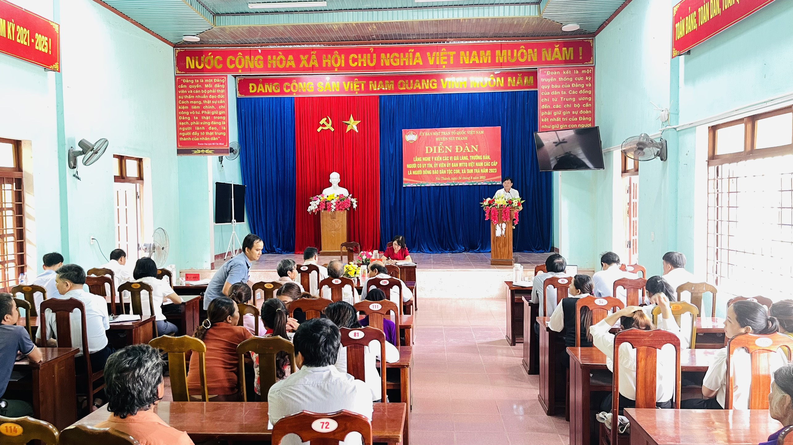 Tại Diễn đàn, Ngô Đức An, UVBTV Huyện uỷ, Phó Chủ tịch UBND huyện đã thông tin tình hình kinh tế - xã hội, an ninh quốc phòng của huyện 6 tháng đầu năm 2023 và kết quả triển khai công tác dân tộc, chính sách dân tộc trên địa bàn xã Tam Trà. Và ông nhấn mạnh: Các Già làng, Trưởng bản, Người có uy tín trong đồng bào dân tộc là những người tiêu biểu, gương mẫu, cốt cán trong các phong trào của địa phương, “giữ lửa” ở các bản, làng, thể hiện rõ nét qua việc vận động đồng bào các dân tộc giữ gìn, phát huy bản sắc văn hóa dân tộc, những phong tục tập quán tốt đẹp, di sản văn hóa, lễ hội truyền thống, xóa bỏ hủ tục lạc hậu, bài trừ mê tín dị đoan; là cầu nối giữa cấp ủy, chính quyền với người dân, tích cực đóng góp xây dựng hệ thống chính trị cơ sở, giữ gìn an ninh trật tự và tăng cường khối đại đoàn kết dân tộc; trong xóa đói giảm nghèo, xây dựng nông thôn mới…