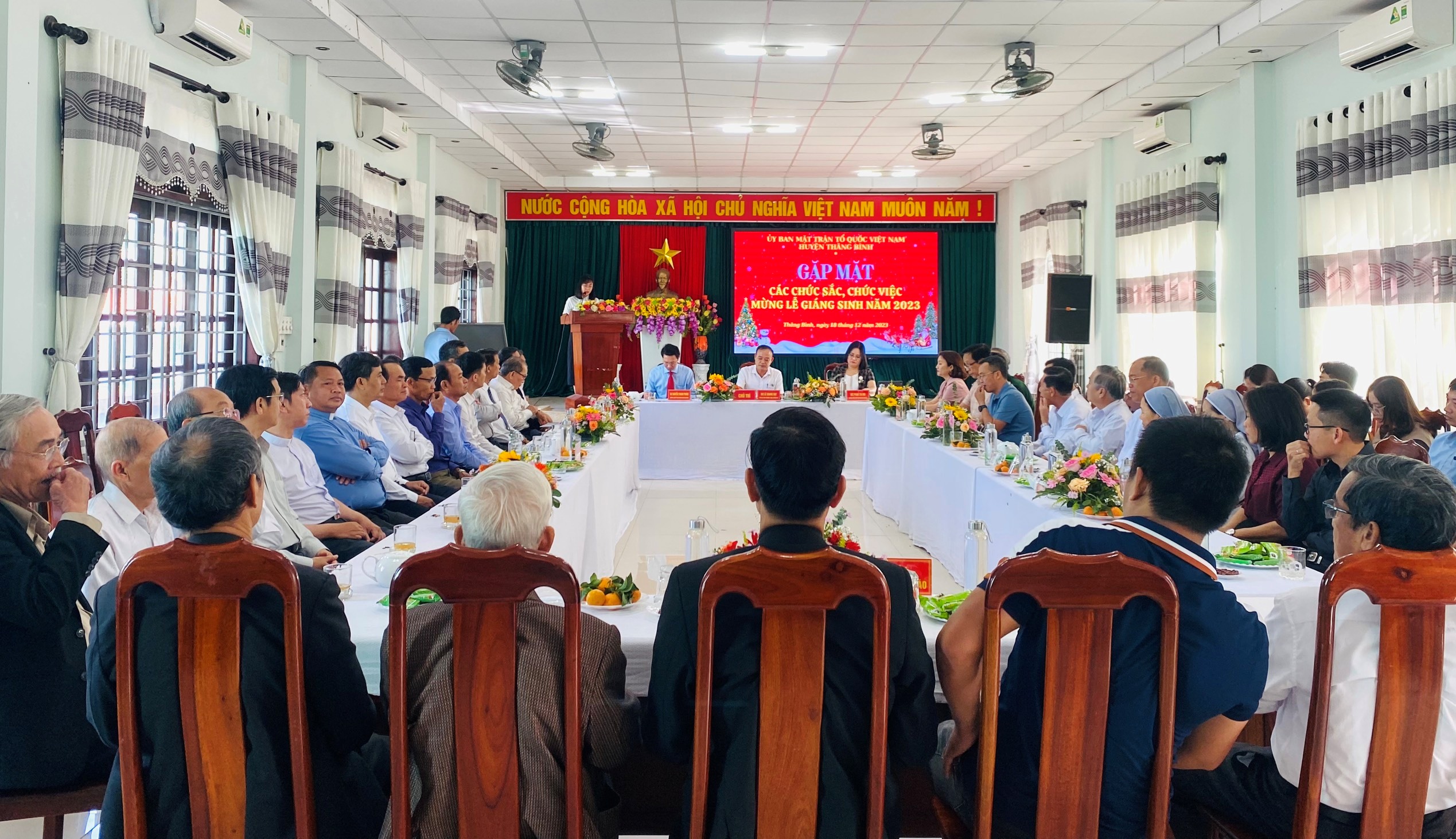 Tại buổi gặp mặt, các đại biểu đã được nghe Thư chúc mừng Lễ Giáng sinh năm 2023 của Chủ tịch Ủy ban MTTQ Việt Nam tỉnh Quảng Nam; đại diện lãnh đạo UBND huyện thông báo tình hình kinh tế-xã hội, quốc phòng an ninh trên địa bàn huyện năm 2023, một số định hướng trong thời gian đến.