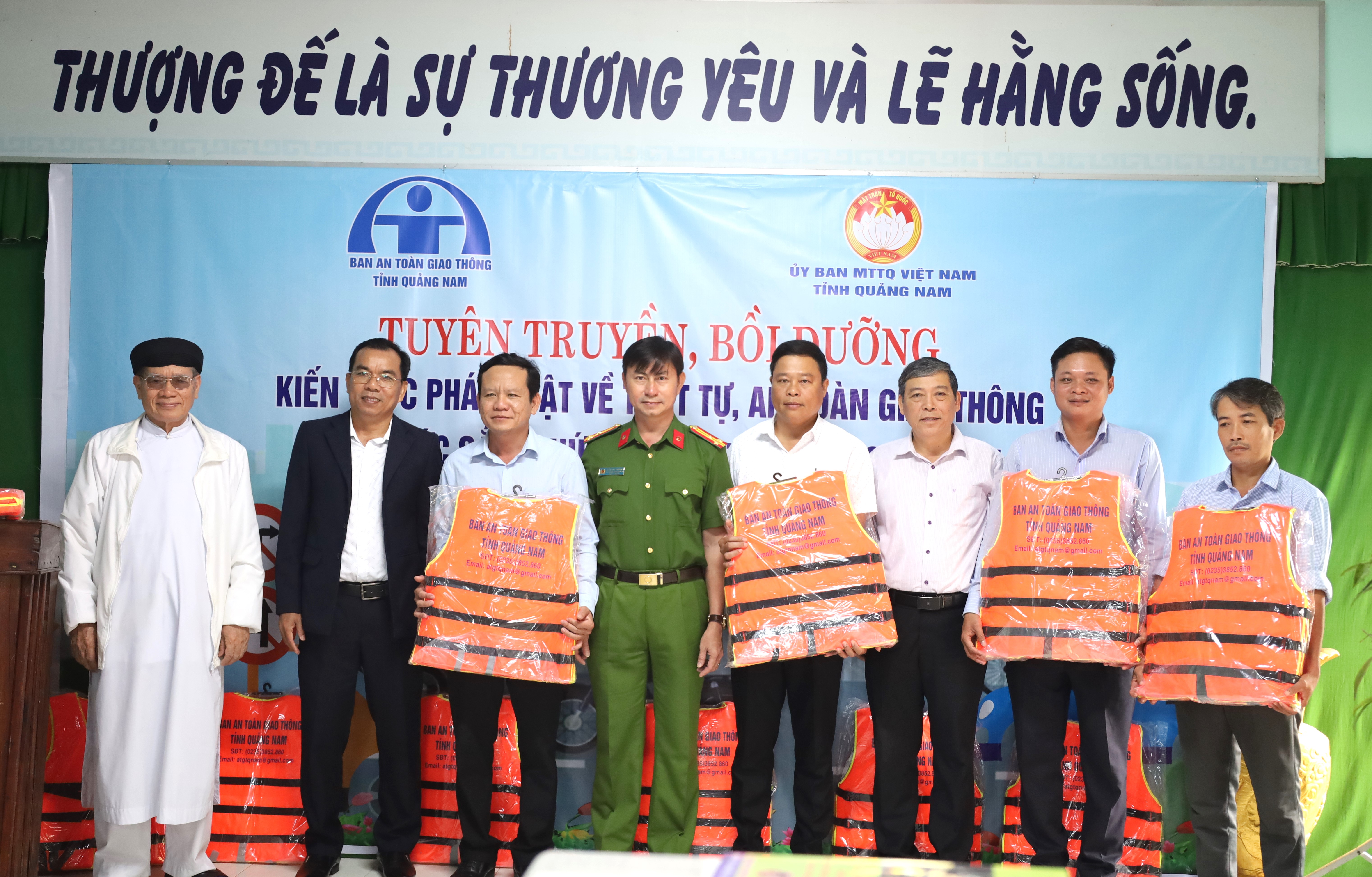 Dịp này, Ban An toàn giao thông tỉnh đã trao tặng 60 mũ bão hiểm cho bà con tín hữu, 100 áo phao và dụng cụ nổi cho UBND xã Bình Nam.