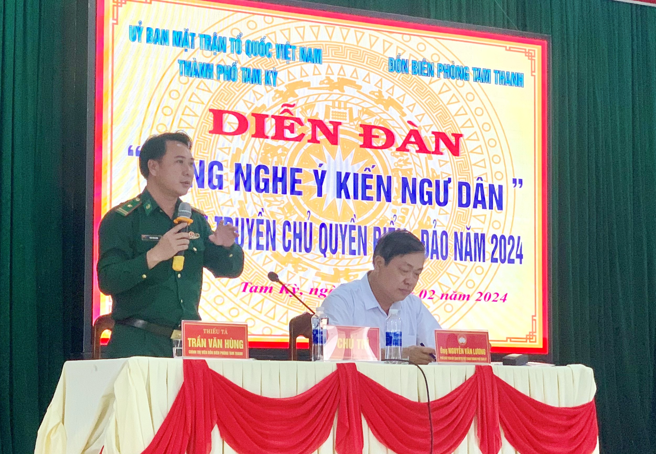 Với tinh thần dân chủ, cầu thị, thẳng thắn, tại diễn đàn, đã ghi nhận 09 ý kiến của bà con ngư dân xoay quanh các nội dung như: Đánh giá cao công tác phối hợp giữa Ủy ban MTTQ Việt Nam thành phố và Đồn Biên phòng Tam Thanh; Cần tăng cường công tác thông tin, tuyên truyền về chủ quyền biên giới biển, đảo, các quy định của Đảng, Nhà nước liên quan đến chính sách, các vùng được đánh bắt, khai thác... để bà con ngư dân nắm rõ hơn nữa; Có biện pháp tuyên truyền, xử lý nghiêm đối với các ngư dân đánh bắt xâm lấn tại khu vực Tam Thanh; sử dụng công cụ khai thác, đánh bắt hải sản mang tính hủy diệt. Nhiều tàu thuyền có công suất lớn của ngư dân các vùng lân cận (Bình Hải, Bình Nam, Tam Tiến) tham gia đánh bắt trên sông Trường Giang thuộc khu vực Tam Kỳ làm hư hỏng phương tiện của bà con ngư dân và gây ô nhiễm môi trường tại sông; Đề xuất tạo điều kiện, giúp đỡ đối với các ngư dân bị tai nạn trên biển...