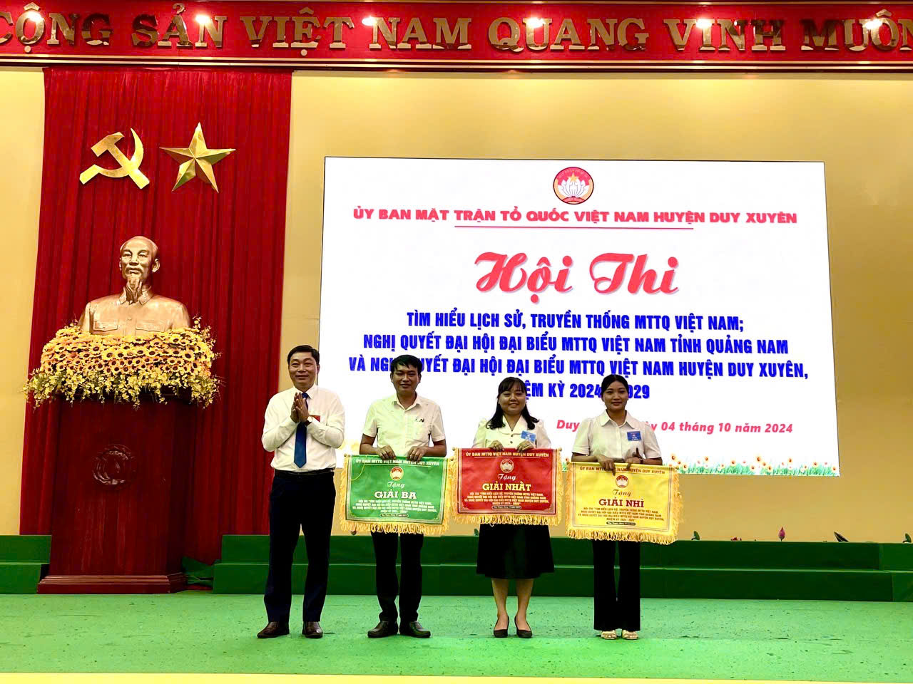 Về dự Hội thi, có ông Nguyễn Công Dũng - Tỉnh ủy viên, Bí thư Huyện ủy, Chủ tịch HĐND huyện, bà Lê Thị Như Thủy - Ủy viên Thường trực, Trưởng ban Tuyên giáo-Tổ chức-Dân tộc-Tôn giáo Ủy ban MTTQ Việt Nam tỉnh, ông Nguyễn Thanh Hải, Ủy viên Ban Thường vụ Huyện ủy, Chủ tịch Ủy ban MTTQ Việt Nam huyện; ông Đặng Hữu Phúc - Huyện uỷ viên, Phó Chủ tịch UBND tỉnh; ông Nguyễn Thanh Sơn - Ủy viên Ban Thường vụ Huyện ủy, Phó Chủ tịch HĐND huyện, ông Nguyễn Tiến - Ủy viên Ban Thường vụ Huyện ủy, Trưởng ban Dân vận Huyện ủy, cùng đại diện lãnh đạo Ban Tuyên giáo Huyện ủy, Phòng Văn hóa và Thông tin huyện, VNPT Thăng Bình - Duy Xuyên, Ban Thường trực Ủy ban MTTQ Việt Nam xã, thị trấn, các thí sinh và cổ động viên của 14 xã, thị trấn trên địa bàn huyện.