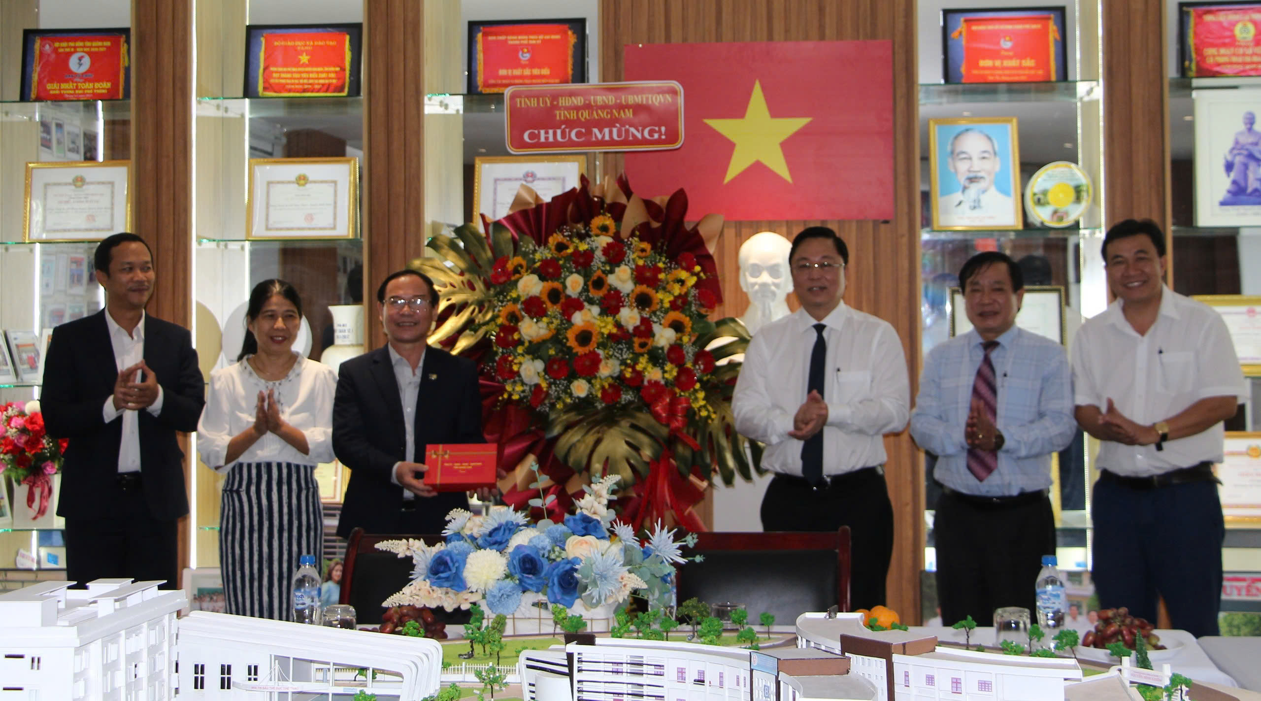 Ông Lê Trí Thanh, UVBTV Tỉnh ủy, Chủ tịch Ủy ban MTTQ Việt tỉnh tặng hoa chúc mừng Trường chuyên Lê Thánh Tông (Hội An)