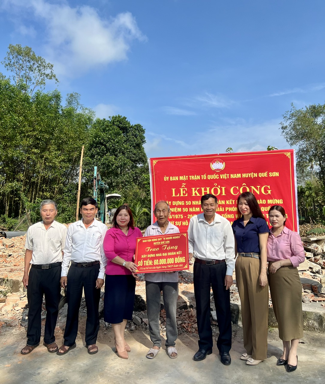 Năm 2025, Ngân hàng TMCP Quân đội đã ủng hộ Quỹ “Vì người nghèo” huyện Quế Sơn 3 tỷ đồng để xây dựng 50 nhà Đại đoàn kết cho hộ nghèo, cận nghèo, hộ có hoàn cảnh đặc biệt khó khăn (mỗi nhà 60 triệu đồng). Dự kiến các ngôi nhà này hoàn thành xây dựng và đưa vào sử dụng trước tháng 7/2025.