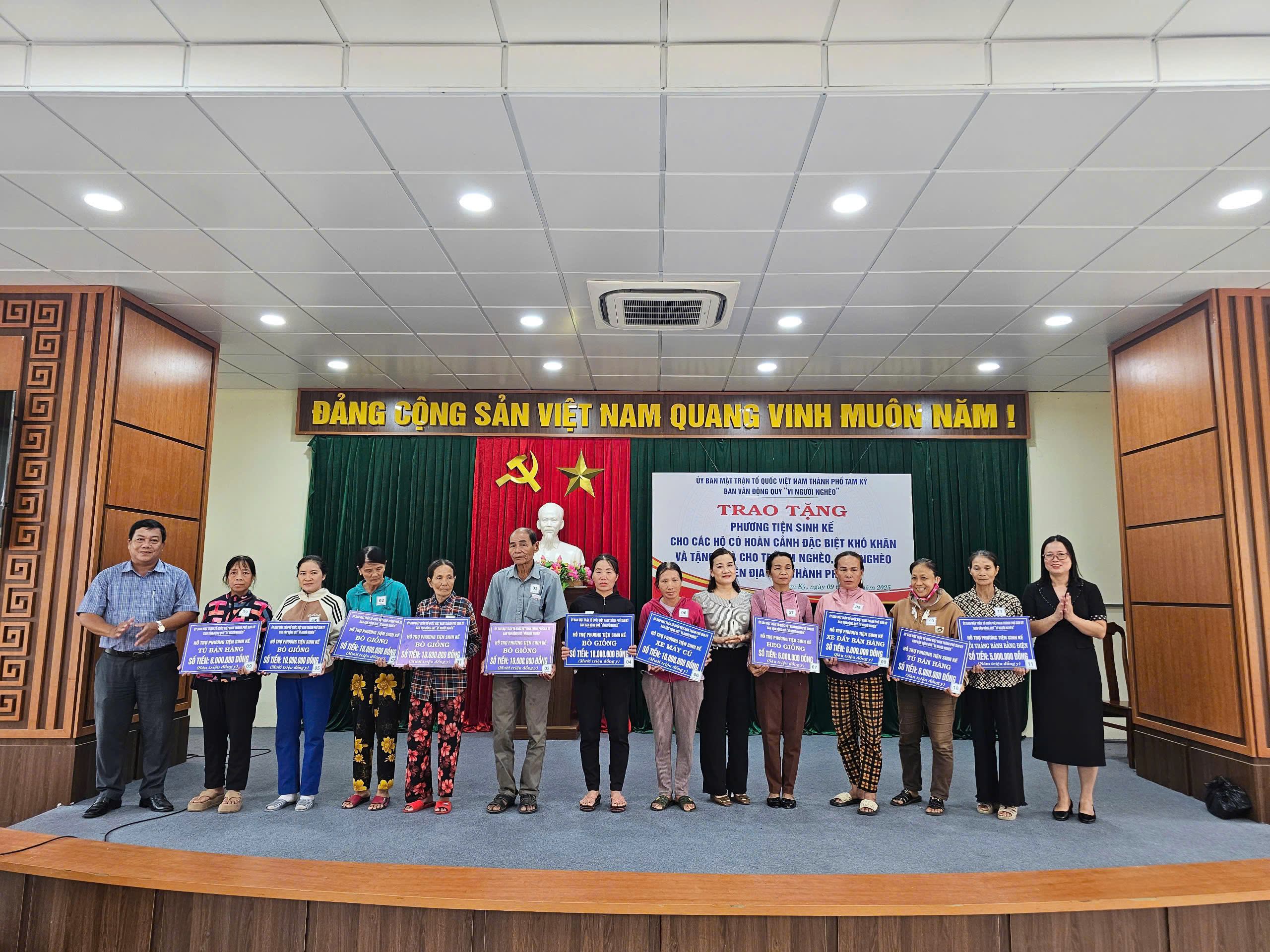 Bên cạnh đó, vào chiều ngày 09/6, Ủy ban MTTQ Việt Nam thành phố đã tổ chức chương trình “Trao tặng phương tiện sinh kế cho các hộ có hoàn cảnh đặc biệt khó khăn và tặng quà cho trẻ em nghèo, cận nghèo trên địa bàn thành phố”. Chương trình đã trao 13 phương tiện sản xuất, con vật nuôi như: Xe đẩy bán hàng; tủ bán mì, bún; Nồi tráng bánh bằng điện; Bò giống; heo giống, trao 68 suất quà cho trẻ em nghèo, cận nghèo với tổng giá trị 168 triệu đồng.