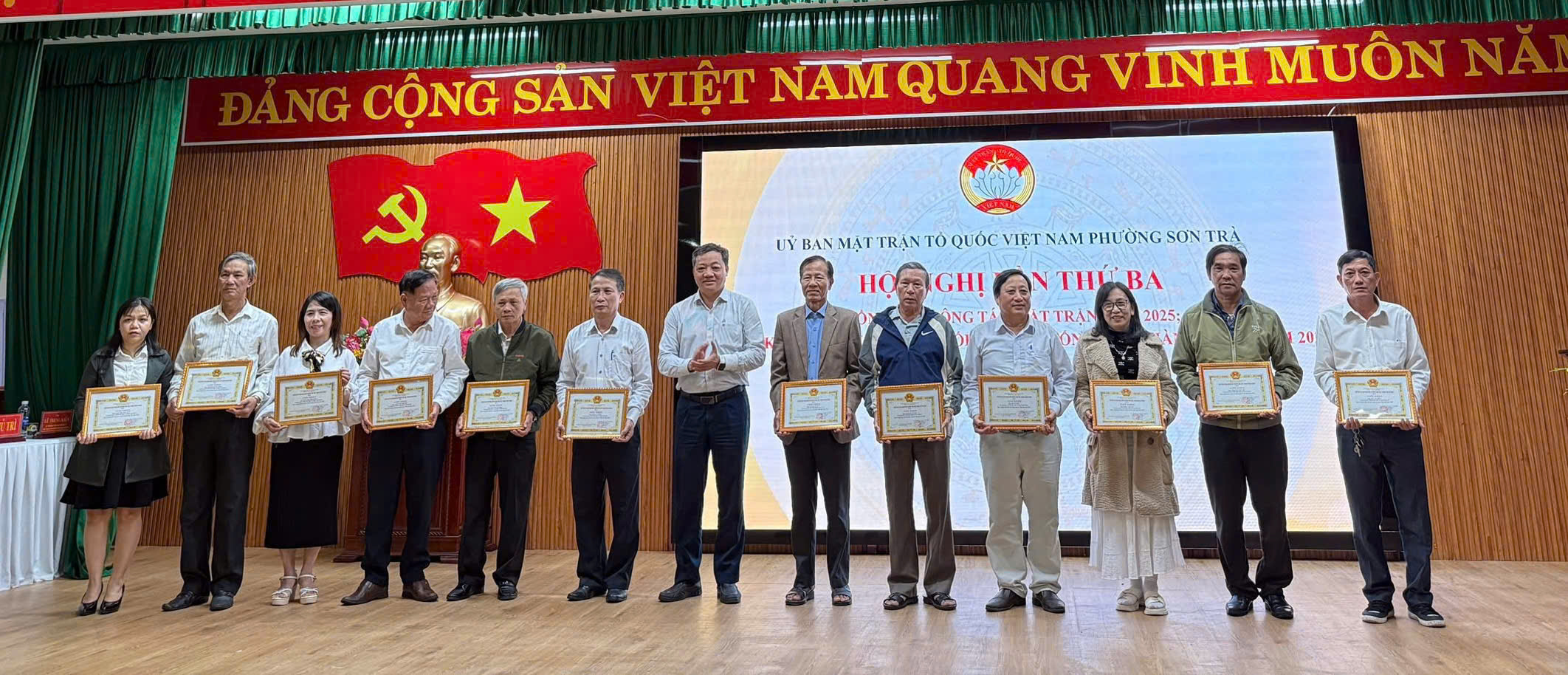 Tại hội nghị, Ủy ban MTTQ Việt Nam thành phố đã trao 2 Bằng khen cho 2 tập thể có thành tích xuất sắc trong công tác Mặt trận năm 2025 và trong thực hiện Cuộc vận động “Toàn dân đoàn kết xây dựng nông thôn mới, đô thị văn minh”. Chủ tịch UBND phường tặng Giấy khen cho 12 tập thể, 12 cá nhân hoàn thành xuất sắc nhiệm vụ năm 2025; đồng thời Mặt trận phường khen thưởng 6 tập thể, 4 cá nhân có nhiều đóng góp trong vận động Quỹ “Vì người nghèo” và các hoạt động cứu trợ, an sinh xã hội tại địa phương.