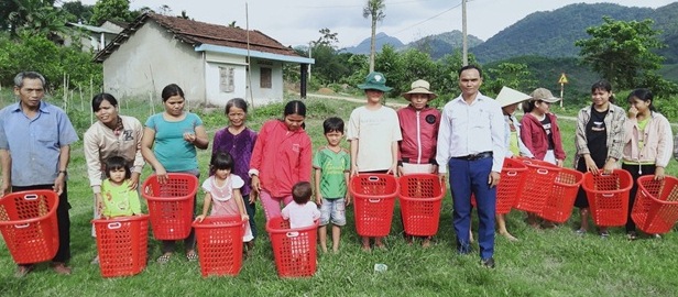 Chủ tịch Ủy ban MTTQ Việt Nam xã Trà Nú cấp hỗ trợ giỏ rác cho người dân trên địa bàn xã,