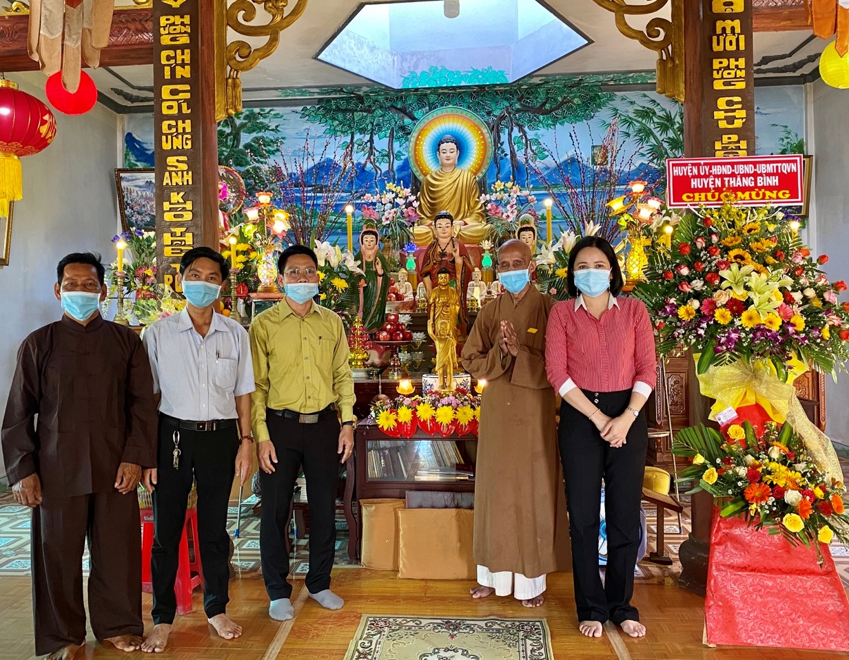 Tại các cơ sở thờ tự, đồng chí Phan Thị Nhi- UVBTV Huyện ủy, Chủ tịch Ủy ban MTTQ Việt Nam huyện đã chúc mừng các chức sắc cùng các tăng ni, phật tử đón mùa Phật đản vui tươi, an lạc. Đồng chí Chủ tịch Ủy ban MTTQ Việt Nam huyện cho biết, thời gian qua trước những diễn biến phức tạp của dịch Covid-19 cùng với cả nước, tỉnh, huyện Thăng Bình đã và đang kiểm soát tốt tình hình dịch bệnh, đảm bảo đời sống sinh hoạt của người dân; đồng thời ghi nhận và cảm ơn sự đóng góp tích cực của các chức sắc, tín đồ Phật giáo đối với sự phát triển kinh tế - xã hội, đảm bảo an ninh - quốc phòng trên địa bàn huyện. Đặc biệt trong thời gian qua, hưởng ứng lời kêu gọi của Đảng, Nhà nước, Ủy ban MTTQ Việt Nam các cấp, Ban Trị sự giáo hội Phật giáo Việt Nam huyện cùng các Chùa trên địa bàn huyện đã hướng dẫn, vận động các tăng, ni, phật tử, các cơ sở thờ tự thực hiện nghiêm túc các quy định về phòng, chống, dịch bệnh; dừng mọi hoạt động lễ nghi tôn giáo tập trung đông người và tham gia tích cực vào cuộc bầu cử đại biểu Quốc hội khóa XV và đại biểu HĐND các cấp nhiệm kỳ 2021-2026.