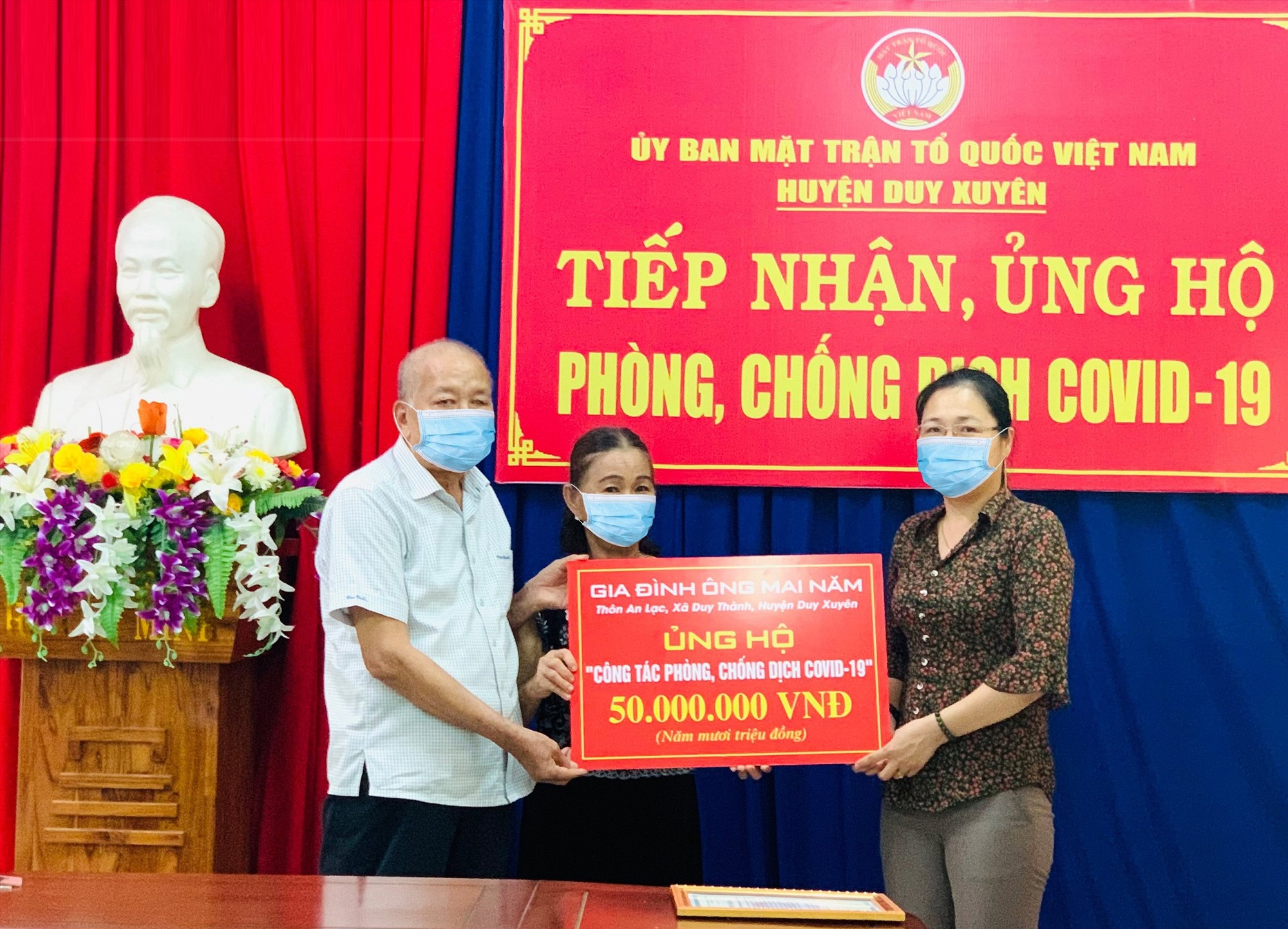 Duy Xuyên: Hưởng ứng Lời kêu gọi "Toàn dân đoàn kết, ra sức phòng, chống dịch bệnh Covid-19" của Đoàn Chủ tịch Ủy ban Trung ương Mặt trận Tổ quốc Việt Nam, với truyền thống yêu nước, sức mạnh đại đoàn kết, tinh thần tương thân tương ái, tình cảm, trách nhiệm của cơ quan, tổ chức, cá nhân doanh nghiệp, các tôn giáo, các nhà hảo tâm đối với xã hội, đến ngày 25/6/2021, Ủy ban MTTQ Việt Nam huyện Duy Xuyên đã tiếp nhận được số tiền là 130.000.000 đồng ủng hộ công tác phòng, chống dịch Covid-19.