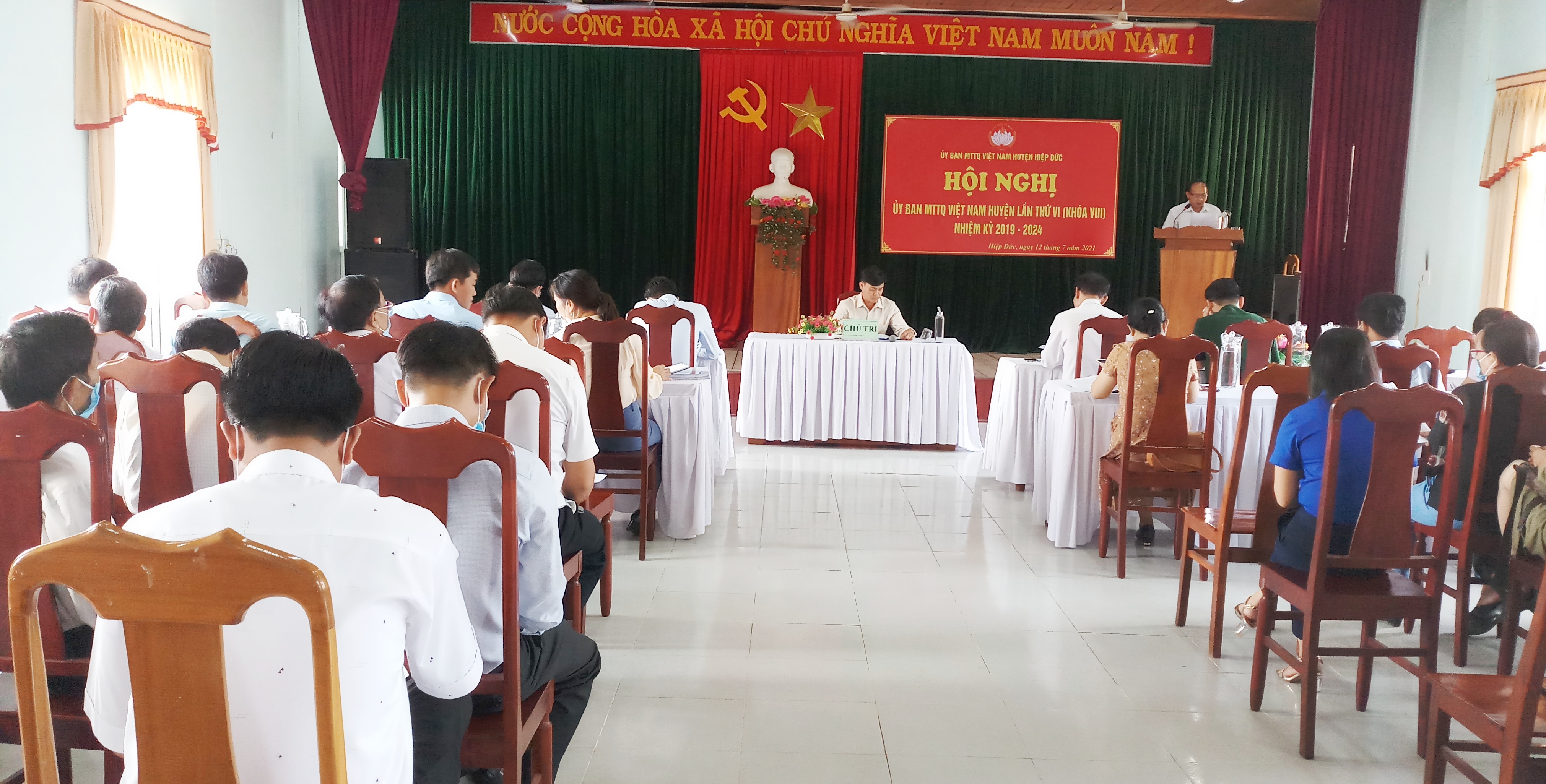 Hiệp Đức: Sáng ngày 12/7/2021, Ban Thường trực Ủy ban MTTQ Việt Nam huyện tổ chức Hội nghị Ủy ban MTTQ Việt Nam huyện lần thứ 6, khóa VIII, nhiệm kỳ 2019-2024 nhằm đánh giá kết quả công tác Mặt trận 6 tháng đầu năm, dự kiến chương trình công tác trọng tâm 6 tháng cuối năm 2021; cử bổ sung ủy viên Ủy ban MTTQ Việt Nam huyện.