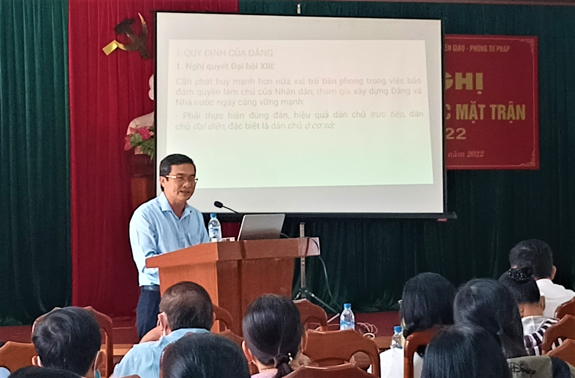 Tại hội nghị, các đại biểu được nghe báo cáo 06 chuyên đề: 1. Triển khai chuyên đề toàn khóa thực hiện Chỉ thị 05-CT/TW về học tập và làm theo tư tưởng, đạo đức, phong cách Hồ Chí Minh theo Kết luận số 01- KL/TW ngày 18/5/2021 của Bộ Chính trị. 2. Nâng cao chất lượng cuộc vận động “Toàn dân đoàn kêt xây dựng nông thôn mới, đô thị văn minh” gắn với phong trào thi đua “Đoàn kết sáng tạo, nâng cao năng suất, chất lượng, hiệu quả, hội nhập quốc tế”; 3. Công tác giám sát và phản biện xã hội, xây dựng Đảng, xây dựng chính quyền của MTTQ Việt Nam và các đoàn thể chính trị - xã hội; Công tác giám sát của Ban Thanh tra nhân dân, giám sát đầu tư cộng đồng; 4. Công tác nắm bắt, phản ánh tình hình dư luận xã hội và tham gia giải quyết những vấn đề bức xúc trong Nhân dân; 5. Tuyên truyền các Luật mới, các văn bản, chính sách pháp luật liên quan đến công tác bồi thường, giải phóng mặt bằng và tái định cư, công tác hòa giải cơ sở; 6. Hướng dẫn công tác văn phòng và thi đua trong năm 2022.