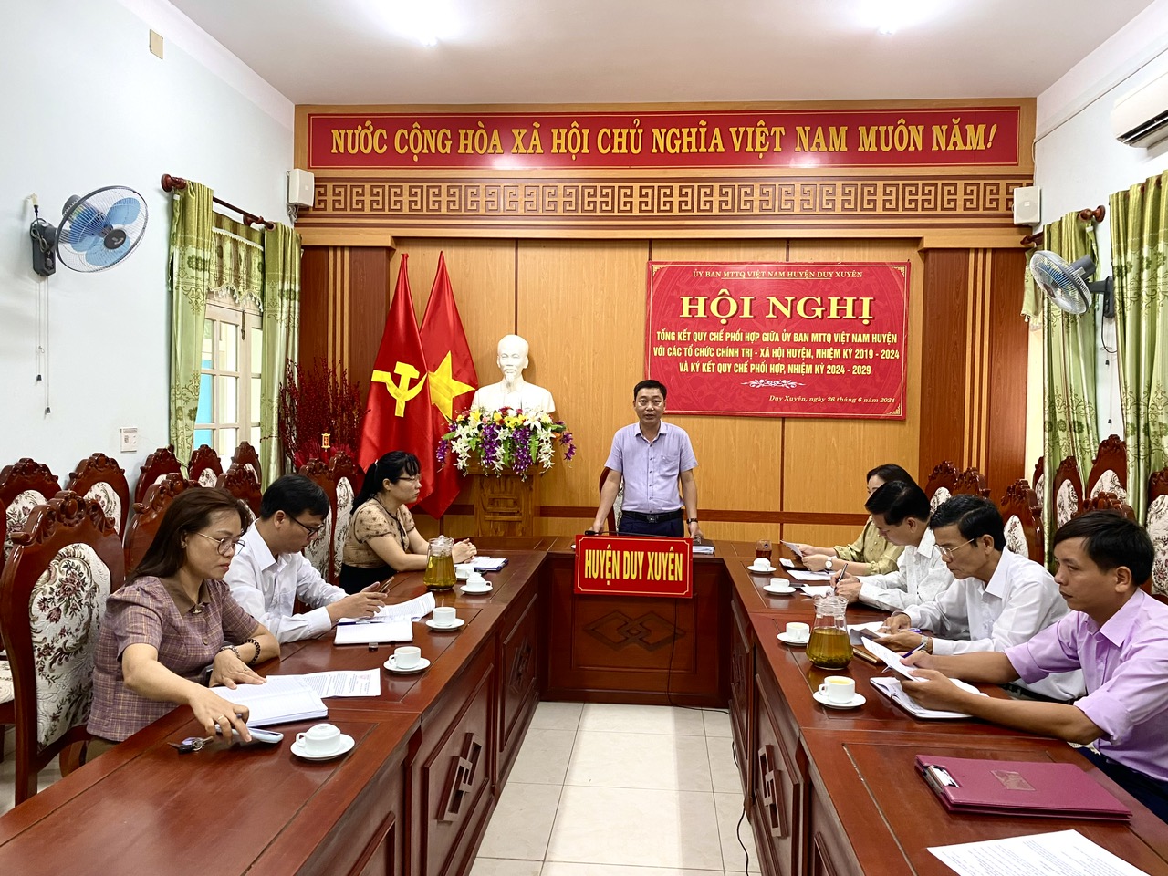 Sáng ngày 26/6/2024, Ủy ban MTTQ Việt Nam huyện Duy Xuyên tổ chức hội nghị đánh giá quy chế phối hợp giữa Ủy ban MTTQ Việt Nam huyện với các tổ chức chính trị - xã hội huyện, nhiệm kỳ 2019 - 2024 và ký kết Quy chế phối hợp nhiệm kỳ 2024 - 2029. Ông Nguyễn Thanh Hải - UVBTV Huyện ủy, Chủ tịch Ủy ban MTTQ Việt Nam huyện chủ trì hội nghị. Tham dự hội nghị có Ban Thường trực Ủy ban MTTQ Việt Nam huyện, lãnh đạo các tổ chức chính trị - xã hội huyện.