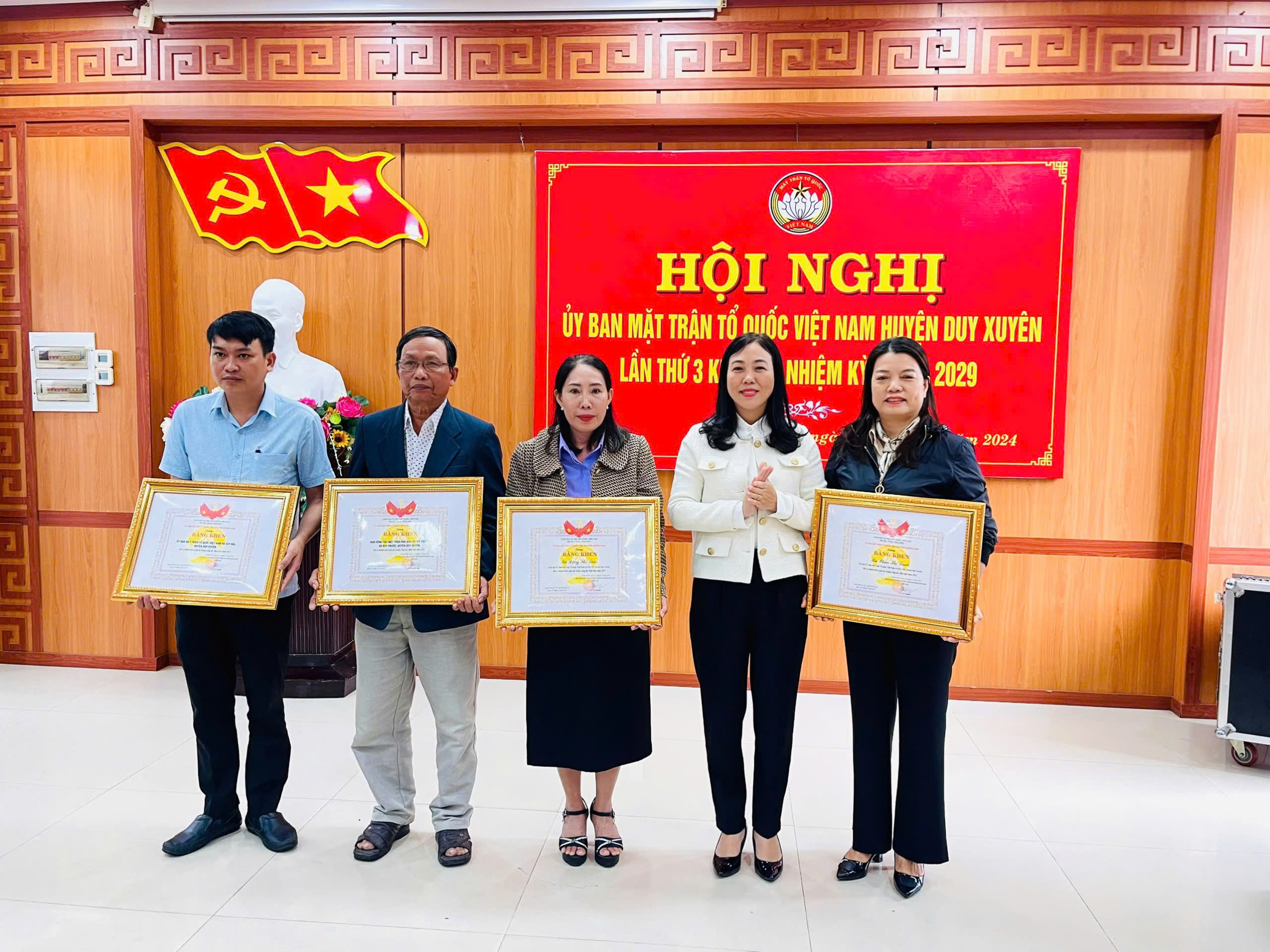 Dịp này, Ban Thường trực Ủy ban MTTQ Việt Nam huyện tặng Cờ dẫn đầu phong trào thi đua năm 2024 cho đơn vị Duy Hải và trao tặng giấy khen cho 23 tập thể và 17 cá nhân có thành tích xuất sắc trong công tác Mặt trận năm 2024./.