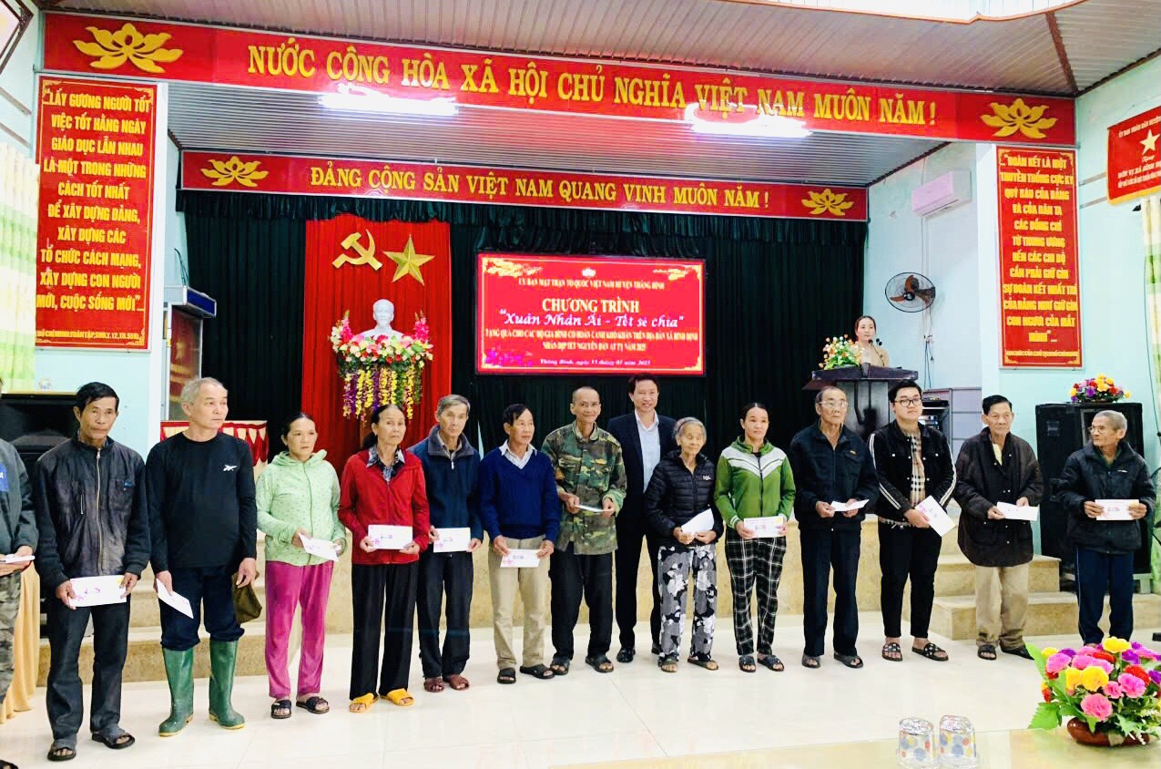 Phát huy truyền thống đại đoàn kết, tinh thần “tương thân, tương ái”, “lá lành đùm lá rách”, tại chương trình Ban Thường trực Ủy ban MTTQ Việt Nam huyện đã trao tặng 200 suất quà cho bà con thuộc diện hộ nghèo, cận nghèo, hộ khó khăn, mỗi suất gồm tiền mặt 500.000 đồng; tổng trị giá 100 triệu đồng từ nguồn quỹ “Vì người nghèo” của huyện. Ông Nguyễn Thanh Phong - UVBTV, Chủ tịch Ủy ban MTTQ Việt Nam huyện cho biết đây là hoạt động hết sức ý nghĩa, thiết thực, góp phần sẻ chia những khó khăn, giúp các hộ nghèo, cận nghèo, đảm bảo mỗi hộ gia đình, mỗi người dân đều đón Tết vui tươi, đầm ấm và phấn khởi. Thông qua chương trình, ông Nguyễn Thanh Phong cũng kêu gọi các tổ chức, đơn vị, cá nhân mạnh thường quân tiếp tục đồng hành cùng địa phương trong nhiều hoạt động, đặc biệt là công tác thiện nguyện, an sinh xã hội nhằm động viên bà con huyện nhà vươn lên trong cuộc sống, nâng cao chất lượng đời sống vật chất và tinh thần, tạo động lực thực hiện thắng lợi các nhiệm vụ kinh tế - xã hội đã đề ra.