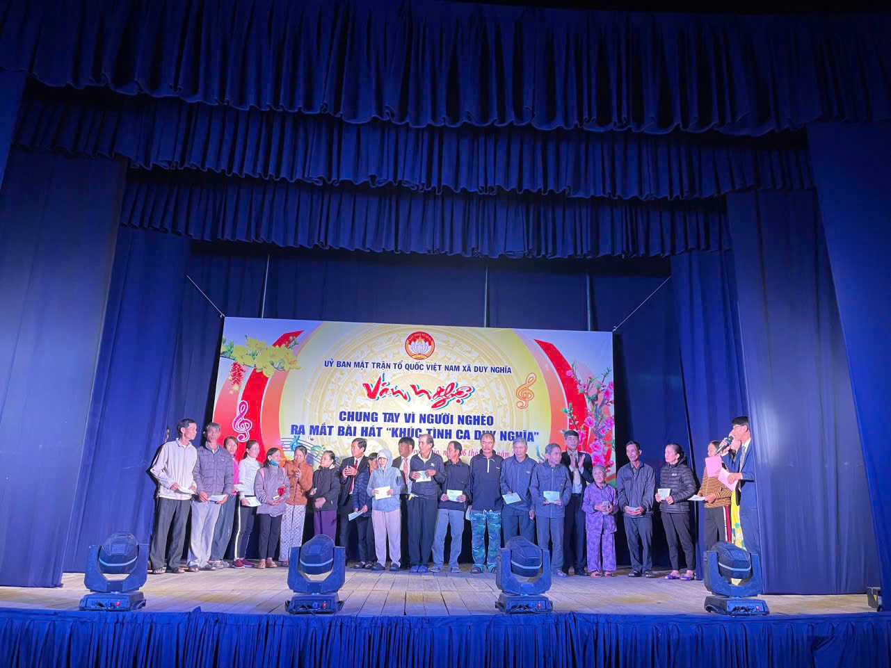 Trong đêm văn nghệ, Ủy ban MTTQ Việt Nam các xã, thị trấn đã vận động được hàng trăm triệu đồng và đã tổ chức tặng quà cho hộ nghèo, hộ cận nghèo, hộ có hoàn cảnh khó khăn trên địa bàn. Nổi bật là xã Duy Vinh vận động được 245 triệu đồng, xã Duy Nghĩa vận động được 85 triệu đồng,…