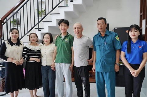 Thanh niên Đỗ Anh Phú (áo xanh) nhận quà động viên của các đoàn thể của phường Cẩm Nam