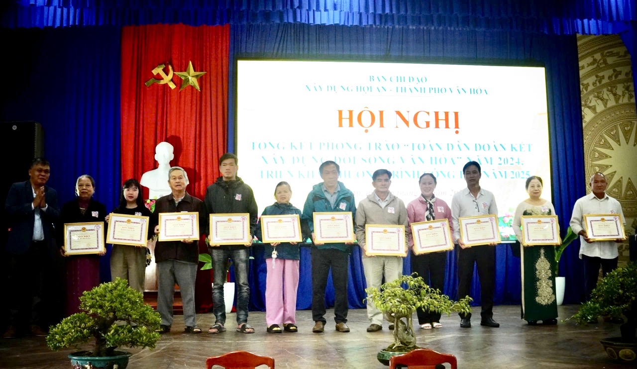 Chủ động phối hợp thực hiện quy trình bình xét, công nhận các danh hiệu văn hóa theo Nghị định số 86 của Chính phủ. MTTQ thành phố hướng dẫn MTTQ các xã, phường phối hợp triển khai thực hiện nghiêm túc và chặt chẽ, đảm bảo tính dân chủ, được Nhân dân đồng tình, tích cực hưởng ứng tham gia thực hiện và phấn đấu đạt chuẩn để được công nhận. Duy trì tổ chức biểu dương, khen thưởng các gia đình văn hóa ở cơ sở được tổ chức gắn với Ngày hội đại đoàn kết toàn dân tộc (18/11) tại khu dân cư đã có tác động mạnh mẽ đến phong trào trong cộng đồng. Bên cạnh đó, các xã, phường đã có nhiều hình thức tổ chức các hoạt động ý nghĩa nhằm giáo dục mọi người ý thức về gia đình, hướng các thành viên giữ gìn truyền thống gia đình Việt, thực hiện tốt các chuẩn mực về nếp sống gia đình, cộng đồng xã hội. Hoạt động này đã góp phần tích cực vào nhiệm vụ xây dựng các danh hiệu văn hóa tại địa phương. Qua bình xét, năm 2024 toàn thành phố có 53/54 thôn, khối phố đạt danh hiệu “Thôn/Khối phố văn hóa”, tỷ lệ 98.15%; trong đó, 5 thôn/khối phố đạt 5 năm liên tục, 2 khối phố đạt 10 năm liên tục. Có 21.966/22.438 hộ đạt danh hiệu “Gia đình văn hóa”, tỷ lệ 97.90%. Có 77/79 tộc họ đạt danh hiệu Tộc họ văn hóa, tỷ lệ 97.46% (01 tộc họ mới đăng ký xây dựng Tộc họ văn hóa năm 2024, chưa đủ điều kiện để xét công nhận).