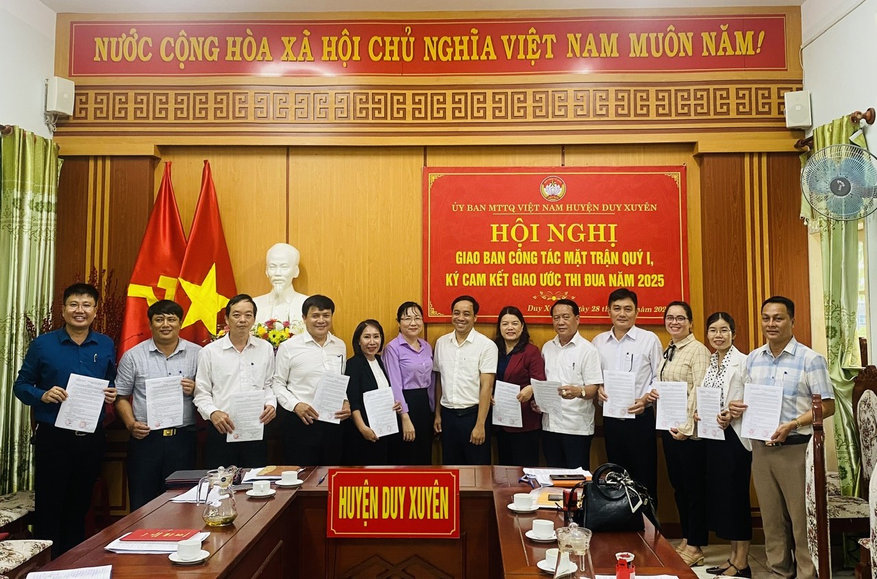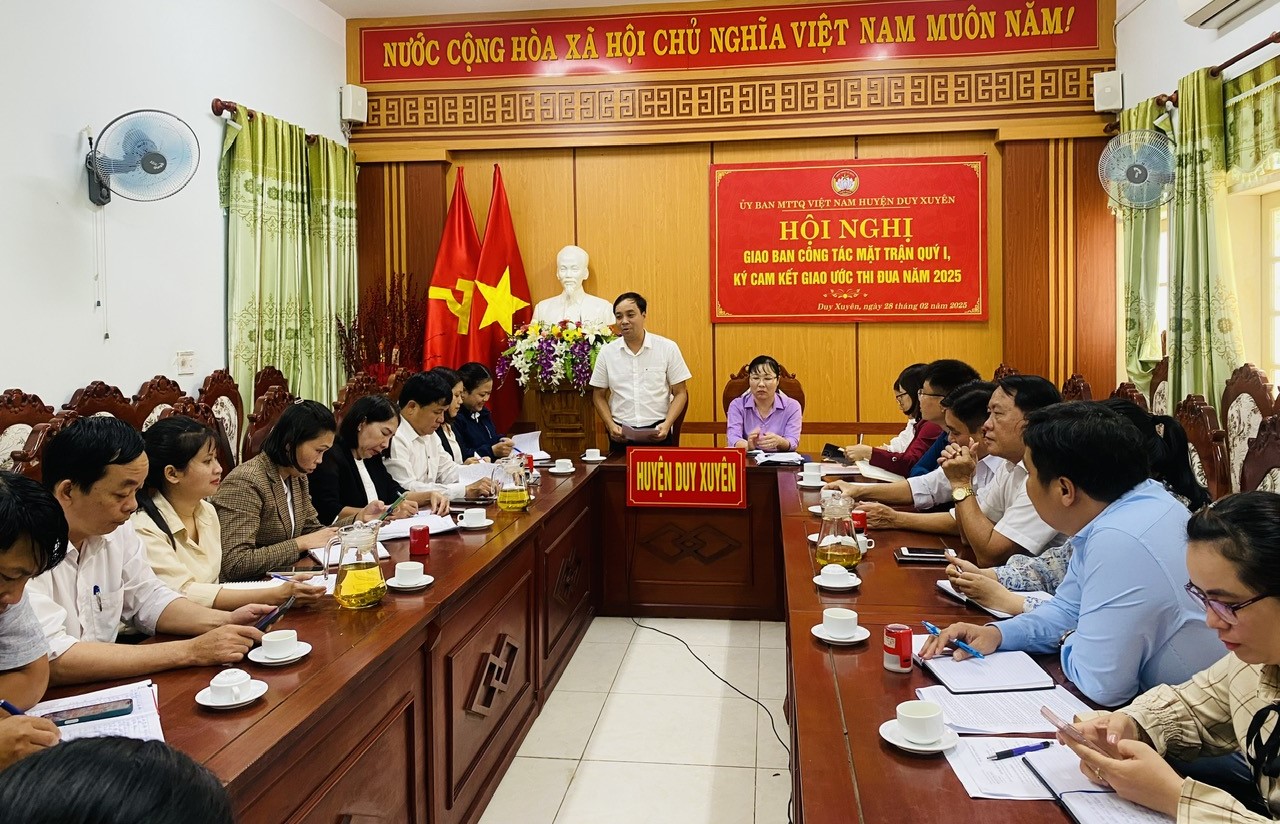 Chiều ngày 28/02, Ủy ban MTTQ Việt Nam huyện Duy Xuyên tổ chức Hội nghị giao ban công tác Mặt trận Quý I và ký kết giao ước thi đua giữa Ủy ban MTTQ Việt Nam huyện với Ủy ban MTTQ Việt Nam các xã, thị trấn năm 2025. Tham dự hội nghị có Ban Thường trực Ủy ban MTTQ Việt Nam huyện Duy Xuyên; Chủ tịch và Phó Chủ tịch Ủy ban MTTQ Việt Nam các xã, thị trấn trên địa bàn huyện.